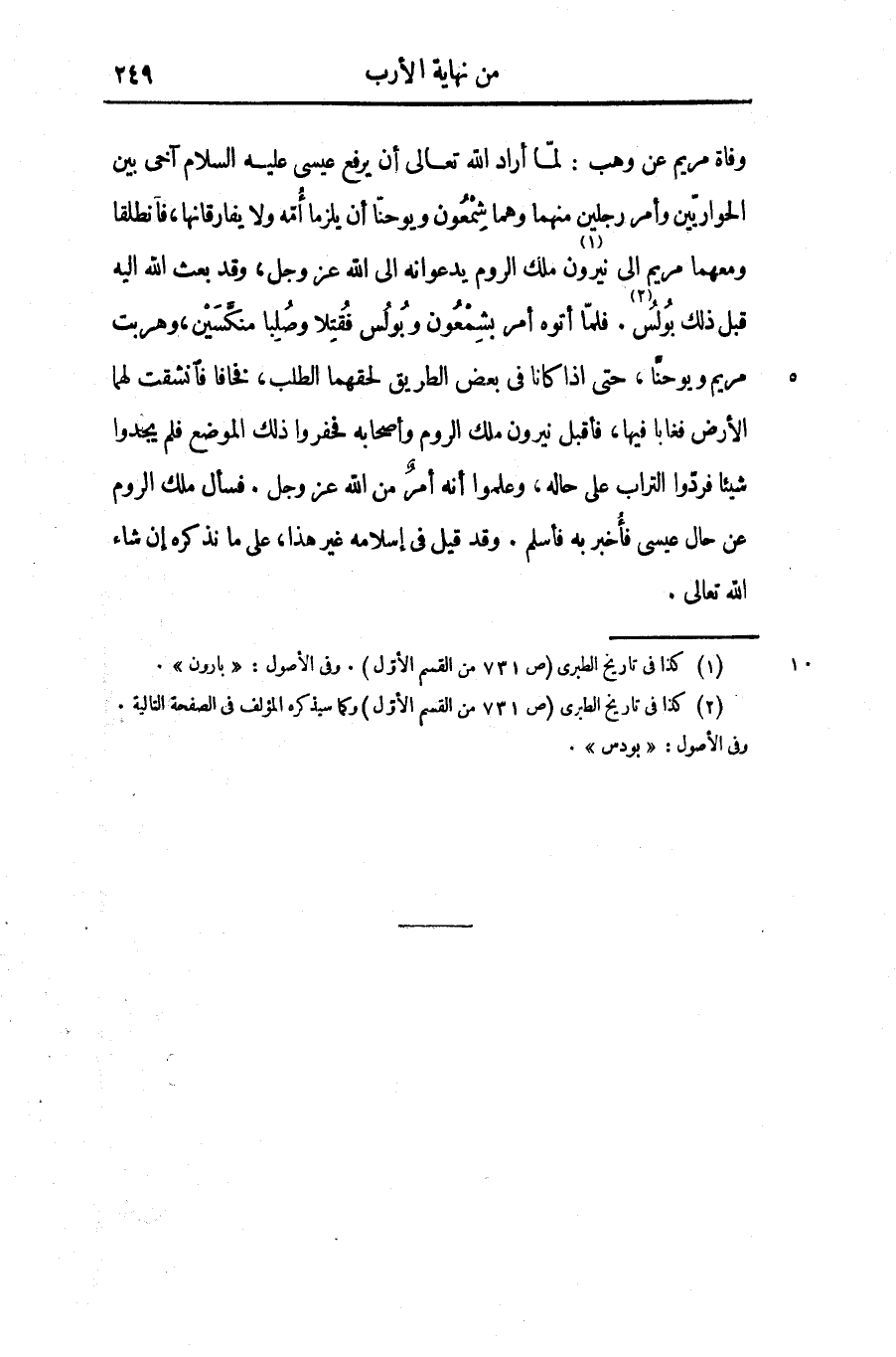 وفاة مريم عن وهب: لمّا أراد الله تعالى أن يرفع عيسى عليه السلام آخى بين الحواريّين وأمر رجلين منهما وهما شمعون ويوحنّا أن يلزما أمّه ولا يفارقانها، فانطلقا ومعهما مريم الى نيرون «1» ملك الروم يدعوانه الى الله عز وجل، وقد بعث الله اليه قبل ذلك بولس «2» . فلمّا أتوه أمر بشمعون وبولس فقتلا وصلبا منكّسين، وهربت مريم ويوحنّا، حتى اذا كانا فى بعض الطريق لحقهما الطلب، فخافا فانشقت لهما الأرض فغابا فيها، فأقبل نيرون ملك الروم وأصحابه فحفروا ذلك الموضع فلم يجدوا شيئا فردّوا التراب على حاله، وعلموا أنه أمر من الله عز وجل. فسأل ملك الروم عن حال عيسى فأخبر به فأسلم. وقد قيل فى إسلامه غير هذا، على ما نذكره إن شاء الله تعالى.