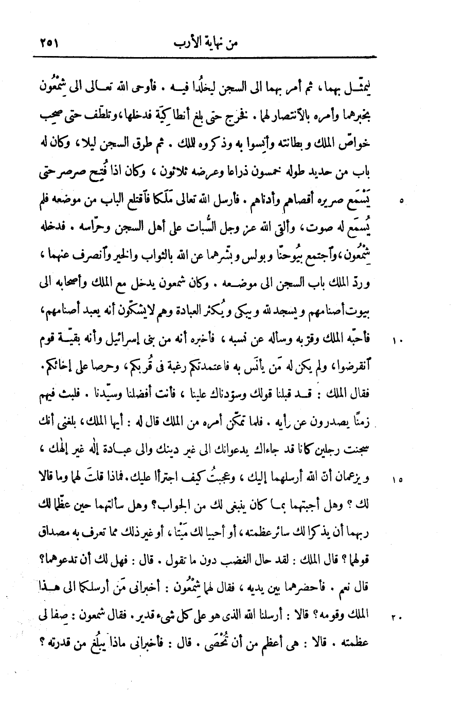 قال نعم. فأحضرهما بين يديه، فقال لهما شمعون: أخبرانى من أرسلكما الى هذا الملك وقومه؟ قالا: أرسلنا الله الذى هو على كل شىء قدير. فقال شمعون: صفا لى عظمته. قالا: هى أعظم من أن تحصى. قال: فأخبرانى ماذا يبلغ من قدرته؟