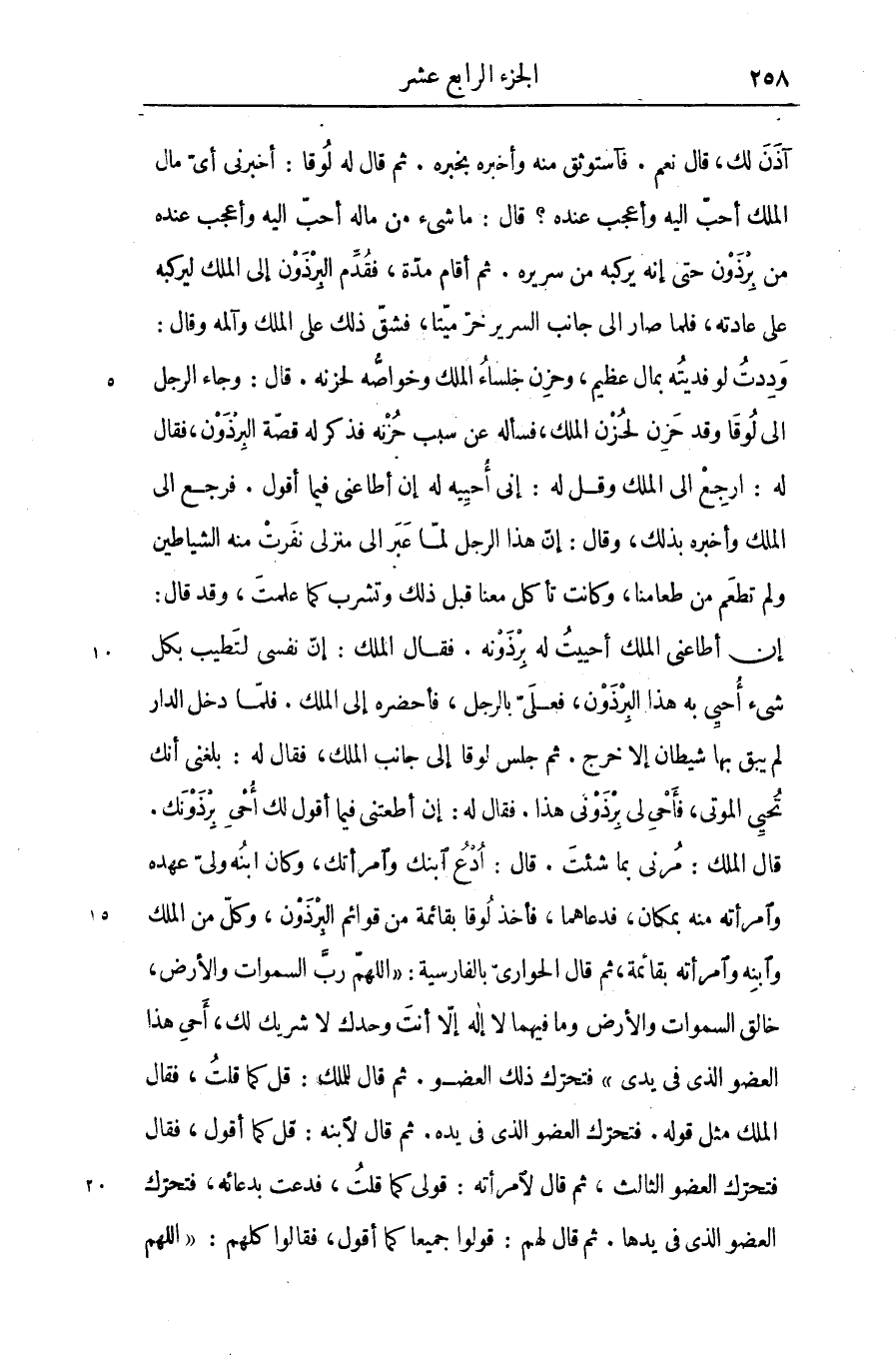 قال الملك: مرنى بما شئت. قال: ادع ابنك وامرأتك، وكان ابنه ولىّ عهده وامرأته منه بمكان، فدعاهما، فأخذ لوقا بقائمة من قوائم البرذون، وكلّ من الملك وابنه وامرأته بقائمة، ثم قال الحوارىّ بالفارسية: «اللهمّ ربّ السموات والأرض، خالق السموات والأرض وما فيهما لا إله إلّا أنت وحدك لا شريك لك، أحى هذا العضو الذى فى يدى» فتحرّك ذلك العضو. ثم قال للملك: قل كما قلت، فقال الملك مثل قوله. فتحرّك العضو الذى فى يده. ثم قال لابنه: قل كما أقول، فقال فتحرّك العضو الثالث، ثم قال لامرأته: قولى كما قلت، فدعت بدعائه، فتحرّك العضو الذى فى يدها. ثم قال لهم: قولوا جميعا كما أقول، فقالوا كلهم: «اللهم