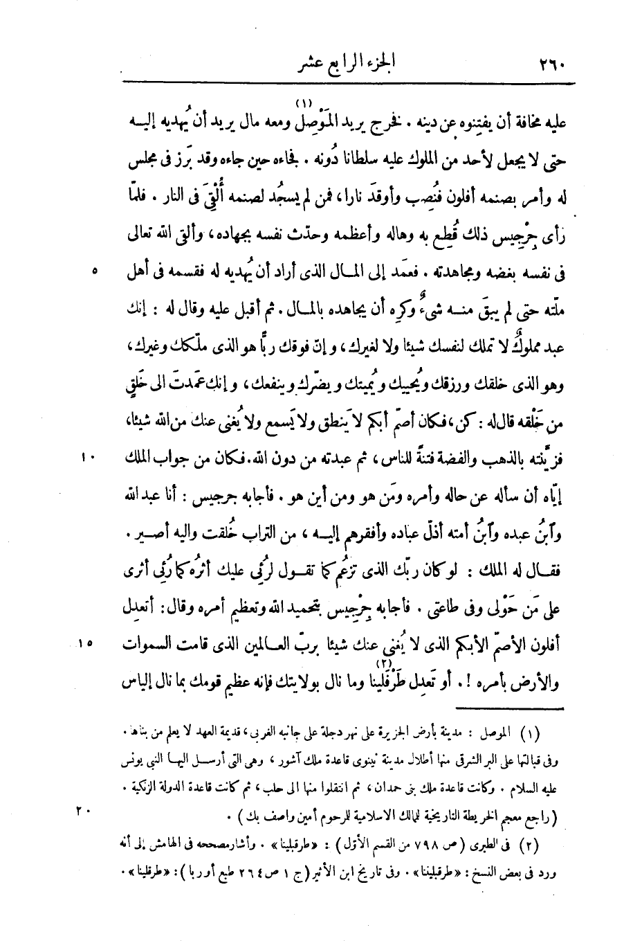 عليه مخافة أن يفتنوه عن دينه. فخرج يريد الموصل «1» ومعه مال يريد أن يهديه إليه حتى لا يجعل لأحد من الملوك عليه سلطانا دونه. فجاءه حين جاءه وقد برز فى مجلس له وأمر بصنمه أفلون فنصب وأوقد نارا، فمن لم يسجد لصنمه ألقى فى النار. فلمّا رأى جرجيس ذلك قطع به وهاله وأعظمه وحدّث نفسه بجهاده، وألقى الله تعالى فى نفسه بغضه ومجاهدته. فعمد إلى المال الذى أراد أن يهديه له فقسمه فى أهل ملّته حتى لم يبق منه شىء وكره أن يجاهده بالمال. ثم أقبل عليه وقال له: إنك عبد مملوك لا تملك لنفسك شيئا ولا لغيرك، وإنّ فوقك ربّا هو الذى ملّكك وغيرك، وهو الذى خلقك ورزقك ويحييك ويميتك ويضرّك وينفعك، وإنك عمدت الى خلق من خلقه قال له: كن، فكان أصمّ أبكم لا ينطق ولا يسمع ولا يغنى عنك من الله شيئا، فزيّنته بالذهب والفضة فتنة للناس، ثم عبدته من دون الله. فكان من جواب الملك إيّاه أن سأله عن حاله وأمره ومن هو ومن أين هو. فأجابه جرجيس: أنا عبد الله وابن عبده وابن أمته أذلّ عباده وأفقرهم إليه، من التراب خلقت واليه أصير.