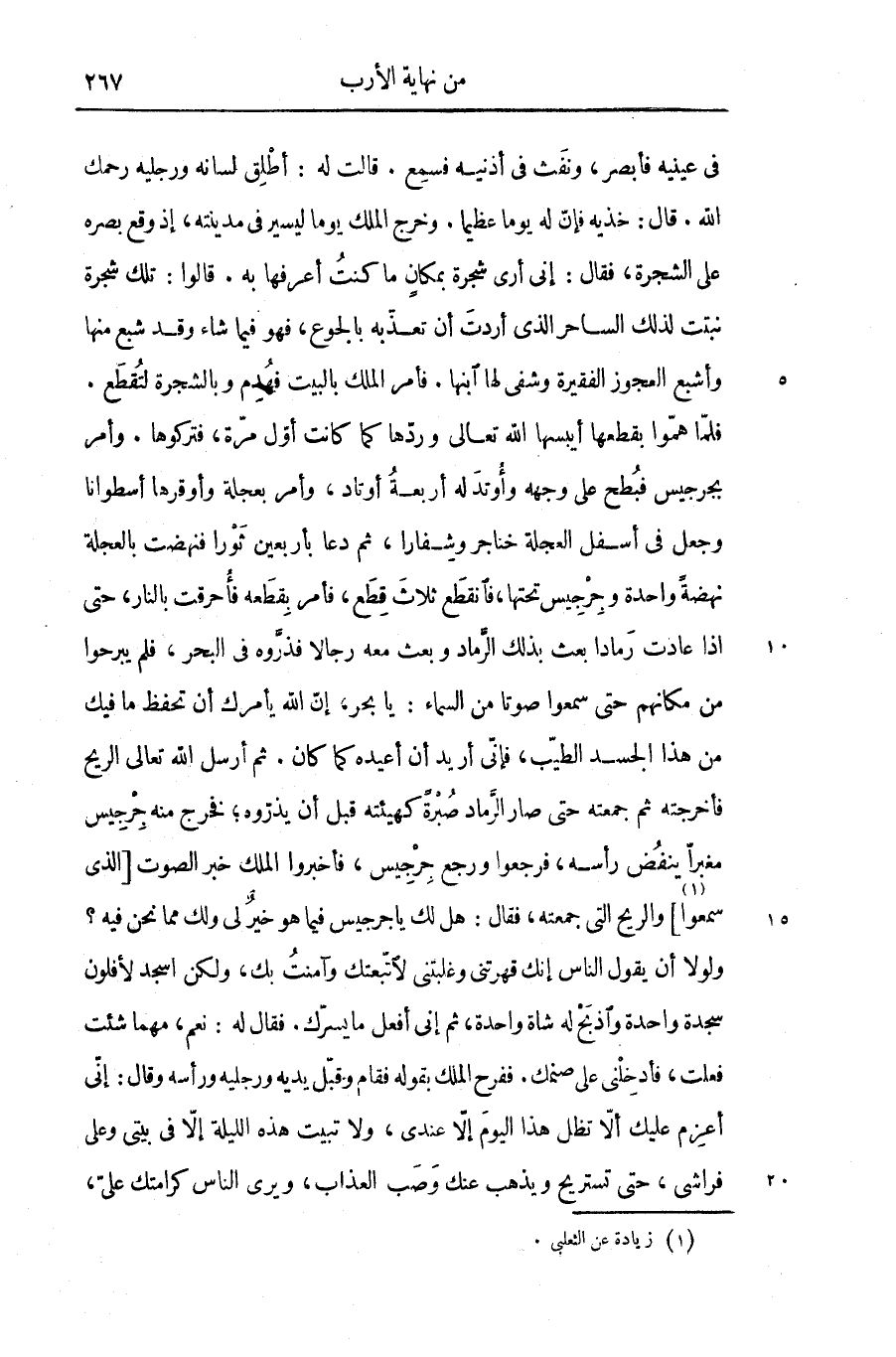 فى عينيه فأبصر، ونفث فى أذنيه فسمع. قالت له: أطلق لسانه ورجليه رحمك الله. قال: خذيه فإنّ له يوما عظيما. وخرج الملك يوما ليسير فى مدينته، إذ وقع بصره على الشجرة، فقال: إنى أرى شجرة بمكان ما كنت أعرفها به. قالوا: تلك شجرة نبتت لذلك الساحر الذى أردت أن تعذّبه بالجوع، فهو فيما شاء وقد شبع منها وأشبع العجوز الفقيرة وشفى لها ابنها. فأمر الملك بالبيت فهدم وبالشجرة لتقطع.