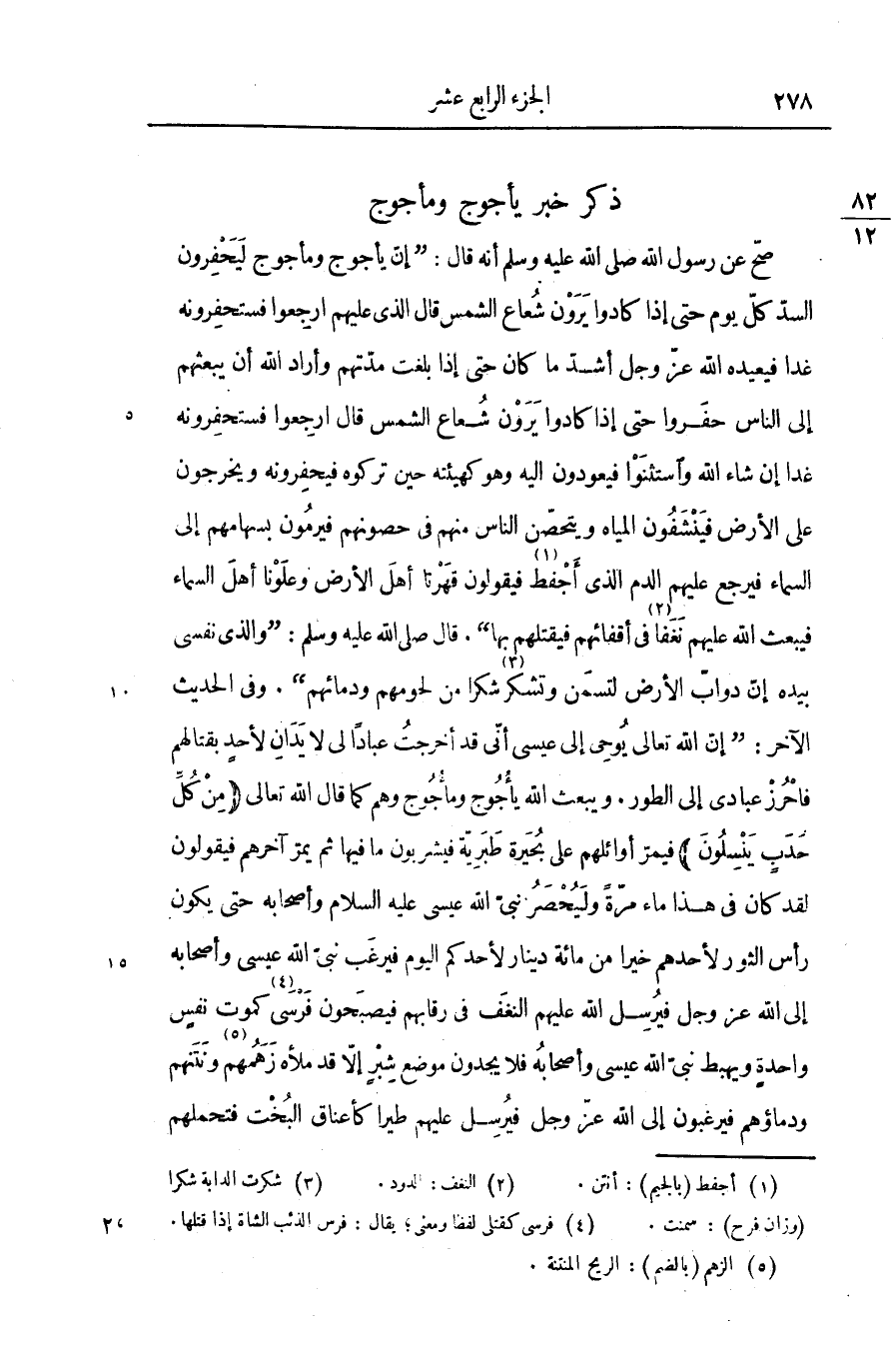 فيمرّ أوائلهم على بحيرة طبريّة فيشربون ما فيها ثم يمرّ آخرهم فيقولون لقد كان فى هذا ماء مرّة وليحصر نبىّ الله عيسى عليه السلام وأصحابه حتى يكون رأس الثور لأحدهم خيرا من مائة دينار لأحدكم اليوم فيرغب نبىّ الله عيسى وأصحابه إلى الله عز وجل فيرسل الله عليهم النغف فى رقابهم فيصبحون فرسى «4» كموت نفس واحدة ويهبط نبىّ الله عيسى وأصحابه فلا يجدون موضع شبر إلّا قد ملأه زهمهم «5» ونتنهم ودماؤهم فيرغبون إلى الله عزّ وجل فيرسل عليهم طيرا كأعناق البخت فتحملهم