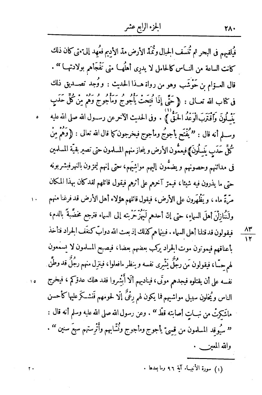 قال العوّام بن حوشب وهو من رواة هذا الحديث: ووجد تصديق ذلك فى كتاب الله تعالى: حَتَّى إِذا فُتِحَتْ يَأْجُوجُ وَمَأْجُوجُ وَهُمْ مِنْ كُلِّ حَدَبٍ يَنْسِلُونَ وَاقْتَرَبَ الْوَعْدُ الْحَقُّ «1»