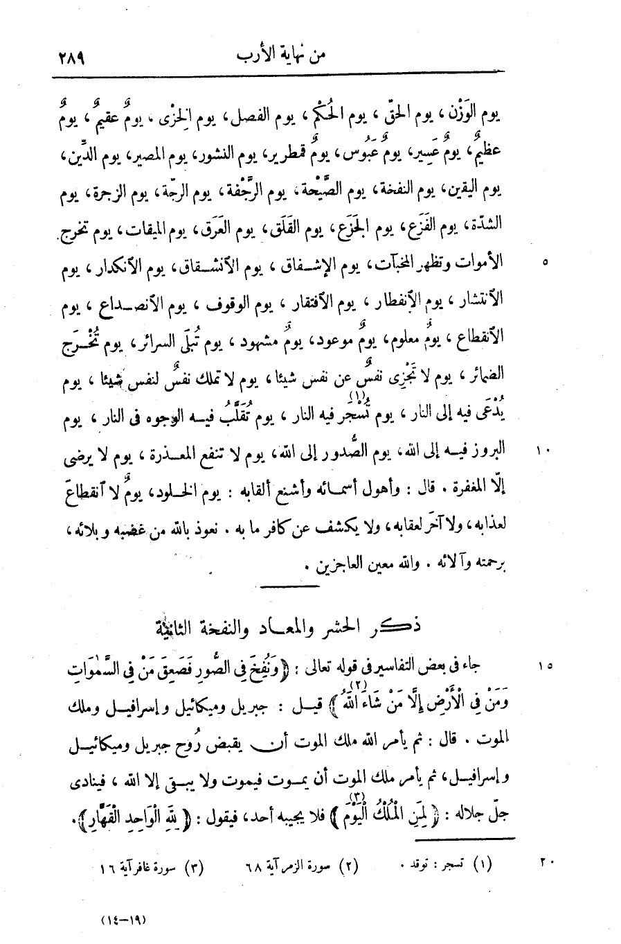 يوم الوزن، يوم الحقّ، يوم الحكم، يوم الفصل، يوم الخزى، يوم عقيم، يوم عظيم، يوم عسير، يوم عبوس، يوم قمطرير، يوم النشور، يوم المصير، يوم الدّين، يوم اليقين، يوم النفخة، يوم الصّيحة، يوم الرّجفة، يوم الرجّة، يوم الزجرة، يوم الشدّة، يوم الفزع، يوم الجزع، يوم القلق، يوم العرق، يوم الميقات، يوم تخرج الأموات وتظهر المخبآت، يوم الإشفاق، يوم الأنشقاق، يوم الانكدار، يوم الانتشار، يوم الانفطار، يوم الافتقار، يوم الوقوف، يوم الانصداع، يوم الانقطاع، يوم معلوم، يوم موعود، يوم مشهود، يوم تبلى السرائر، يوم تخرج الضمائر، يوم لا تجزى نفس عن نفس شيئا، يوم لا تملك نفس لنفس شيئا، يوم يدعى فيه إلى النار، يوم تسجر «1» فيه النار، يوم تقلّب فيه الوجوه فى النار، يوم البروز فيه إلى الله، يوم الصّدور إلى الله، يوم لا تنفع المعذرة، يوم لا يرضى إلّا المغفرة. قال: وأهول أسمائه وأشنع ألقابه: يوم الخلود، يوم لا انقطاع لعذابه، ولا آخر لعقابه، ولا يكشف عن كافر ما به. نعوذ بالله من غضبه وبلائه، برحمته وآلائه. والله معين العاجزين.