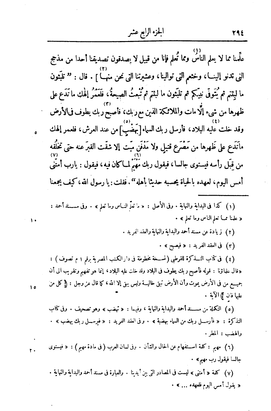 علّمنا مما لا يعلم الناس «1» ومما تعلم فإنا من قبيل لا يصدقون تصديقنا أحدا من مذحج التى تدنو إلينا، وخثعم التى توالينا، وعشيرتنا التى نحن منها «2» ] . قال: «تلبثون ما لبثتم ثم يتوفّى نبيّكم ثم تلبثون ما لبثتم ثم تبعث الصحيحة، فلعمر إلهك ما تدع على ظهرها من شىء إلّا مات والملائكة الذين مع ربك، فأصبح «3» ربك يطوف فى الأرض وقد خلت «4» عليه البلاد، فأرسل ربك السماء [بهضب «5» ] من عند العرش، فلعمر إلهك ما تدع على ظهرها من مصرع قتيل ولا مدفن ميّت إلا شقّت القبر عنه حتى تخلقه من قبل رأسه فيستوى جالسا، فيقول ربك مهم «6» لما كان فيه، فيقول: يا رب أمتّنى «7» أمس اليوم، لعهده بالحياة يحسبه حديثا بأهله» . فقلت: يا رسول الله، كيف يجمعنا