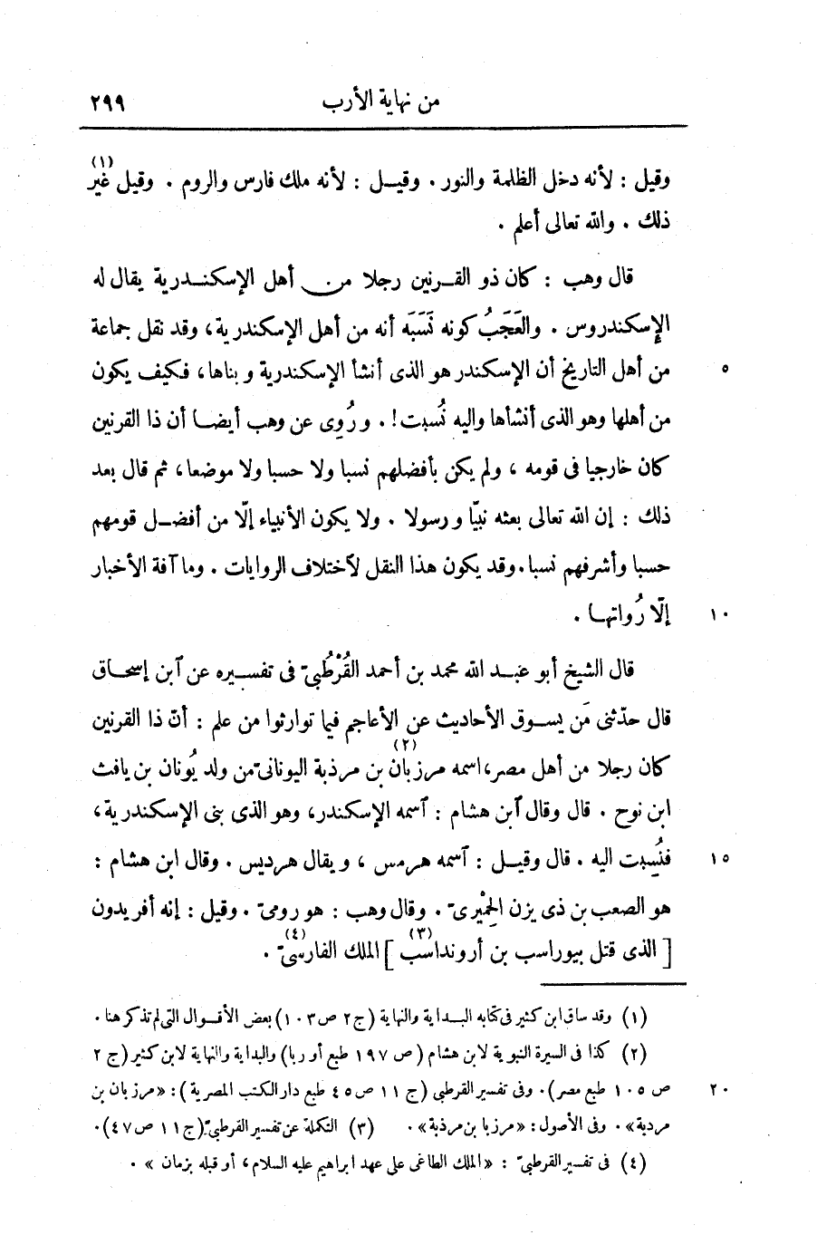 قال الشيخ أبو عبد الله محمد بن أحمد القرطبىّ فى تفسيره عن ابن إسحاق قال حدّثنى من يسوق الأحاديث عن الأعاجم فيما توارثوا من علم: أنّ ذا القرنين كان رجلا من أهل مصر، اسمه مرزبان «2» بن مرذبة اليونانىّ من ولد يونان بن يافث ابن نوح. قال وقال ابن هشام: اسمه الإسكندر، وهو الذى بنى الإسكندرية، فنسبت إليه. قال وقيل: اسمه هرمس، ويقال هرديس. وقال ابن هشام: