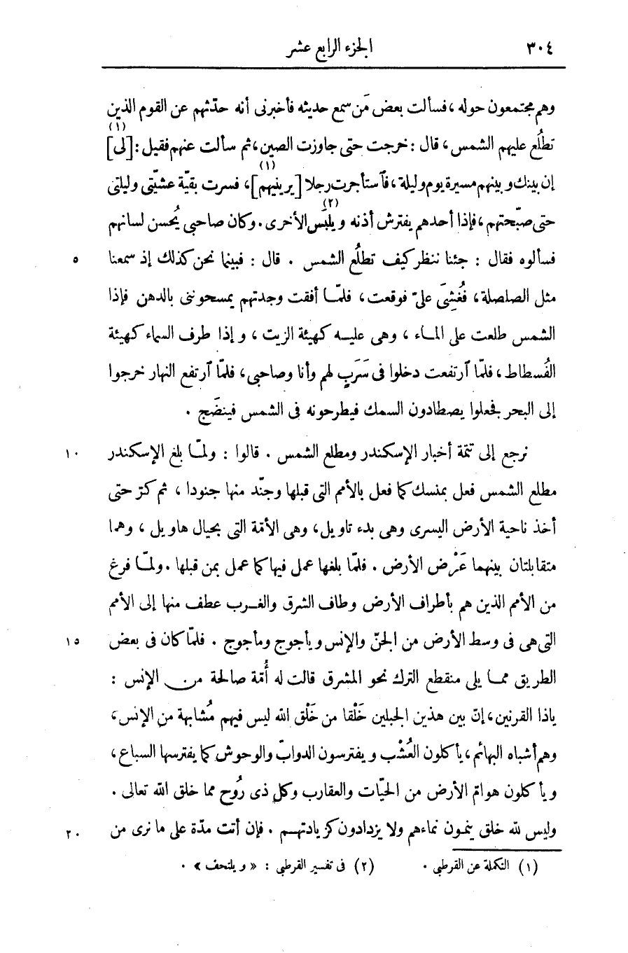 وهم مجتمعون حوله، فسألت بعض من سمع حديثه فأخبرنى أنه حدّثهم عن القوم الذين تطلع عليهم الشمس، قال: خرجت حتى جاوزت الصين، ثم سألت عنهم فقيل: [لى «1» ] إن بينك وبينهم مسيرة يوم وليلة، فاستأجرت رجلا [يرينيهم «2» ] ، فسرت بقيّة عشيّتى وليلتى حتى صبّحتهم، فإذا أحدهم يفترش أذنه ويلبس «3» الأخرى. وكان صاحبى يحسن لسانهم فسألوه فقال: جئنا ننظر كيف تطلع الشمس. قال: فبينما نحن كذلك إذ سمعنا مثل الصلصلة، فغشى علىّ فوقعت، فلمّا أفقت وجدتهم يمسحوننى بالدهن فإذا الشمس طلعت على الماء، وهى عليه كهيئة الزيت، وإذا طرف السماء كهيئة الفسطاط، فلمّا ارتفعت دخلوا فى سرب لهم وأنا وصاحبى، فلمّا ارتفع النهار خرجوا إلى البحر فجعلوا يصطادون السمك فيطرحونه فى الشمس فينضج.