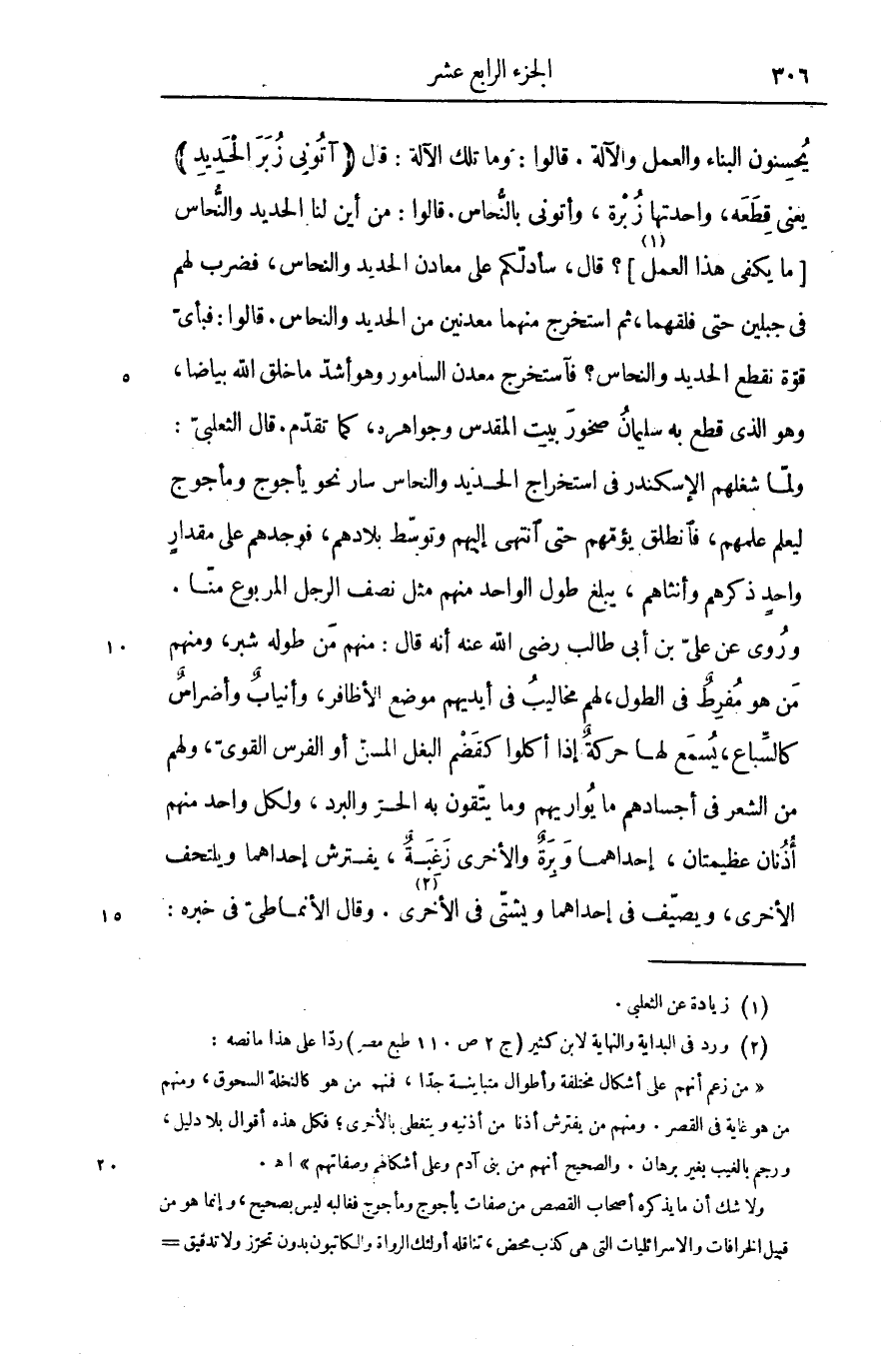 يعنى قطعه، واحدتها زبرة، وأتونى بالنّحاس. قالوا: من أين لنا الحديد والنّحاس [ما يكفى هذا العمل «1» ] ؟ قال، سأدلّكم على معادن الحديد والنحاس، فضرب لهم فى جبلين حتى فلقهما، ثم استخرج منهما معدنين من الحديد والنحاس. قالوا: فبأىّ قوّة نقطع الحديد والنحاس؟ فآستخرج معدن السامور وهو أشدّ ما خلق الله بياضا، وهو الذى قطع به سليمان صخور بيت المقدس وجواهره، كما تقدّم. قال الثعلبىّ: