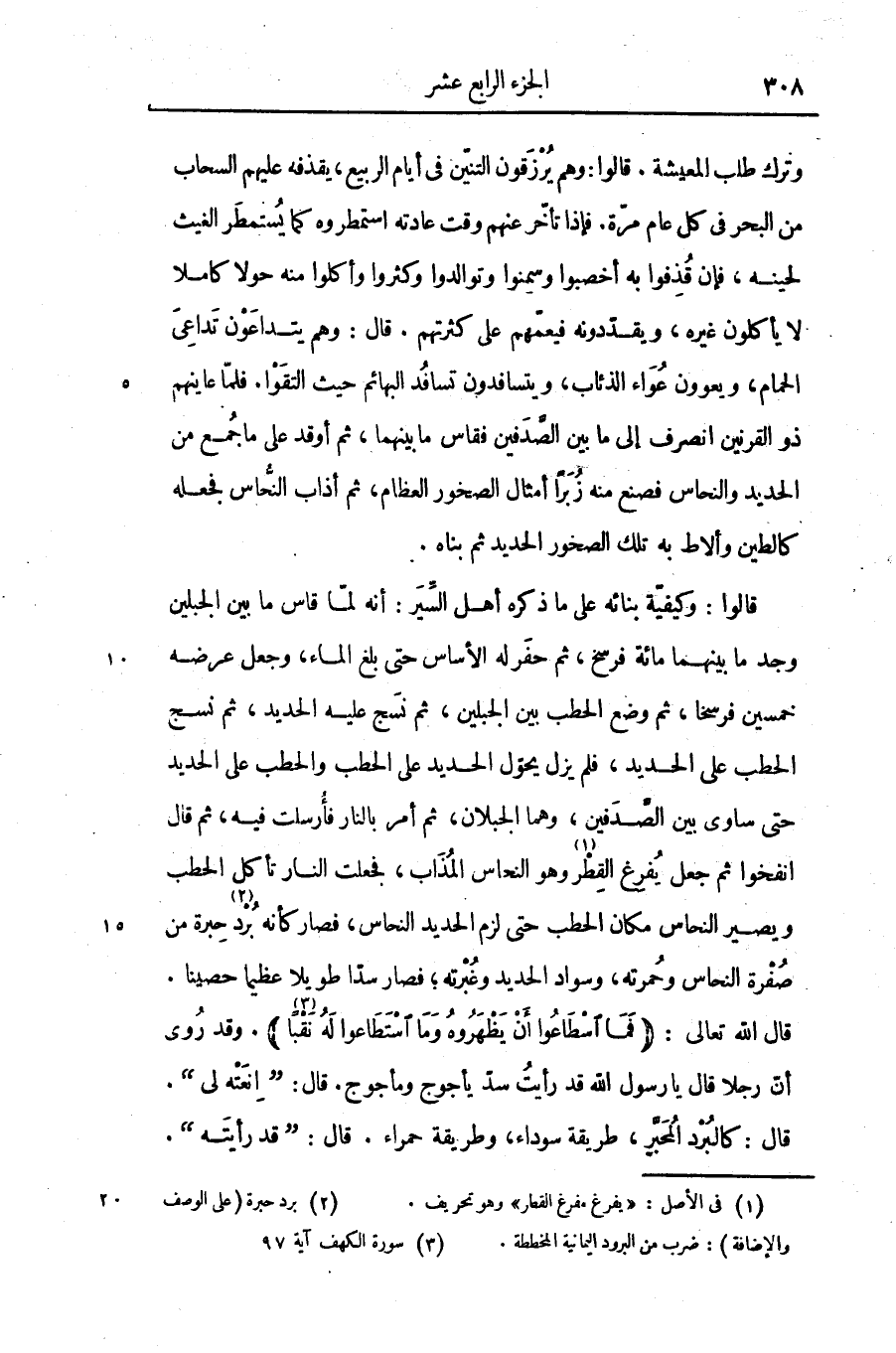 وترك طلب المعيشة. قالوا: وهم يرزقون التنيّن فى أيام الربيع، يقذفه عليهم السحاب من البحر فى كل عام مرّة. فإذا تأخّر عنهم وقت عادته استمطروه كما يستمطر الغيث لحينه، فإن قذفوا به أخصبوا وسمنوا وتوالدوا وكثروا وأكلوا منه حولا كاملا لا يأكلون غيره، ويقدّدونه فيعمّهم على كثرتهم. قال: وهم يتداعون تداعى الحمام، ويعوون عواء الذئاب، ويتسافدون تسافد البهائم حيث التقوا. فلمّا عاينهم ذو القرنين انصرف إلى ما بين الصّدفين فقاس ما بينهما، ثم أوقد على ما جمع من الحديد والنحاس فصنع منه زبرا أمثال الصخور العظام، ثم أذاب النّحاس فجعله كالطين وألاط به تلك الصخور الحديد ثم بناه.