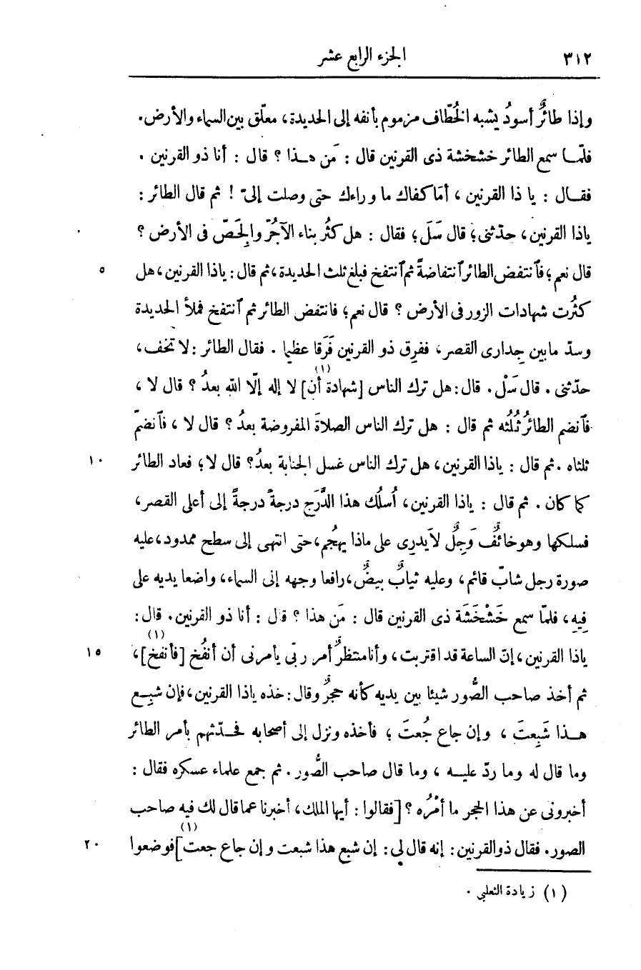 قال نعم؛ فانتفض الطائر انتفاضة ثم انتفخ فبلغ ثلث الحديدة، ثم قال: يا ذا القرنين، هل كثرت شهادات الزور فى الأرض؟ قال نعم؛ فانتفض الطائر ثم انتفخ فملأ الحديدة وسدّ ما بين جدارى القصر، ففرق ذو القرنين فرقا عظيما. فقال الطائر: لا تخف، حدّثنى. قال سل. قال: هل ترك الناس [شهادة أن «1» ] لا إله إلّا الله بعد؟ قال لا، فانضم الطائر ثلثه ثم قال: هل ترك الناس الصلاة المفروضة بعد؟ قال لا، فانضمّ ثلثاه. ثم قال: يا ذا القرنين، هل ترك الناس غسل الجنابة بعد؟ قال لا؛ فعاد الطائر كما كان. ثم قال: يا ذا القرنين، اسلك هذا الدّرج درجة درجة إلى أعلى القصر، فسلكها وهو خائف وجل لا يدرى على ماذا يهجم، حتى انتهى إلى سطح ممدود، عليه صورة رجل شابّ قائم، وعليه ثياب بيض، رافعا وجهه إلى السماء، واضعا يديه على فيه، فلمّا سمع خشخشة ذى القرنين قال: من هذا؟ قال: أنا ذو القرنين. قال: