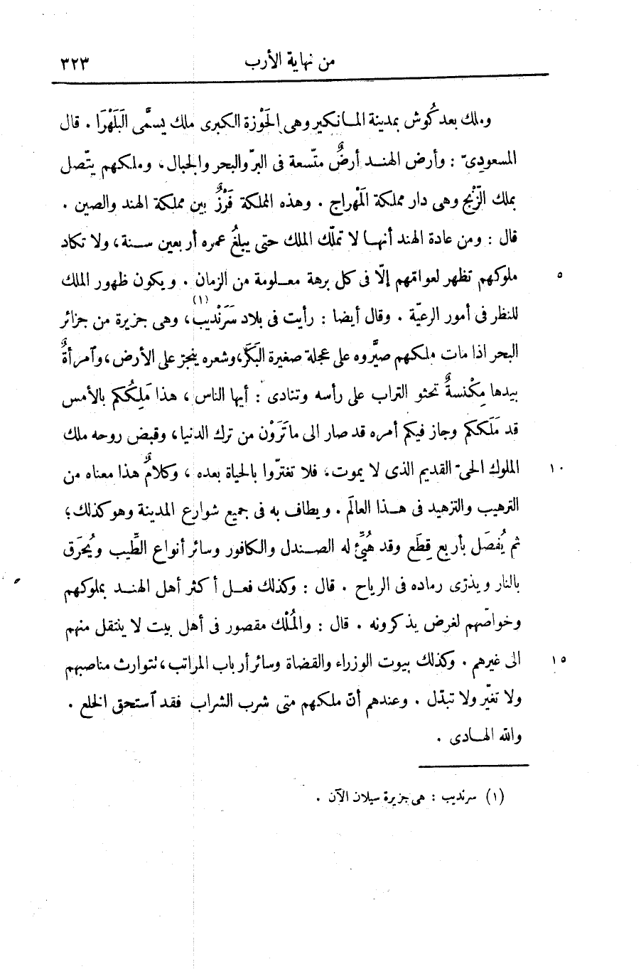قال: ومن عادة الهند أنها لا تملّك الملك حتى يبلغ عمره أربعين سنة، ولا تكاد ملوكهم تظهر لعوامّهم إلّا فى كل برهة معلومة من الزمان. ويكون ظهور الملك للنظر فى أمور الرعيّة. وقال أيضا: رأيت فى بلاد سرنديب»