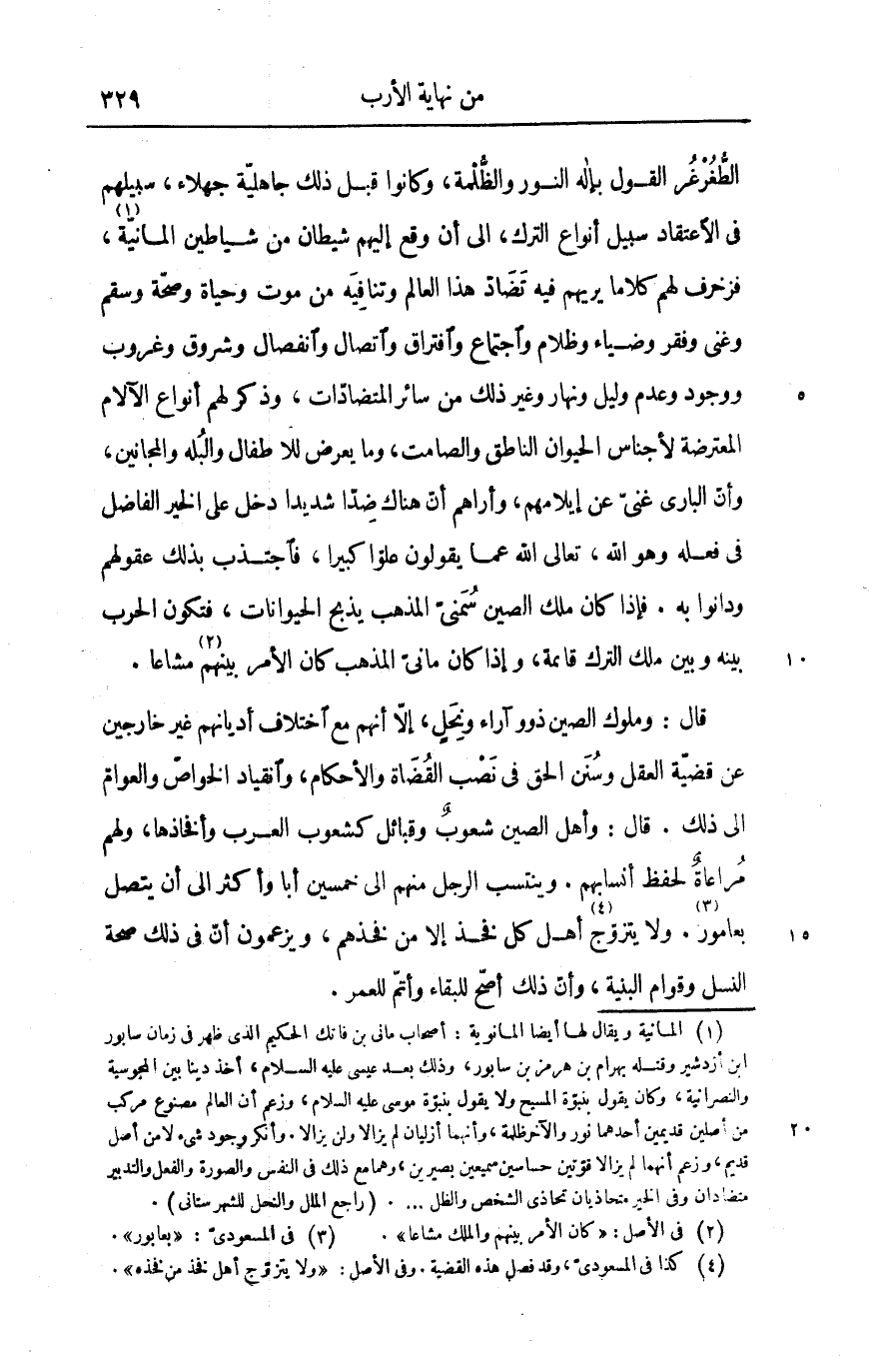 الطّغرغر القول بإله النور والظّلمة، وكانوا قبل ذلك جاهليّة جهلاء، سبيلهم فى الاعتقاد سبيل أنواع الترك، الى أن وقع إليهم شيطان من شياطين المانيّة «1» ، فزخرف لهم كلاما يريهم فيه تضادّ هذا العالم وتنافيه من موت وحياة وصحّة وسقم وغنى وفقر وضياء وظلام واجتماع وافتراق واتصال وانفصال وشروق وغروب ووجود وعدم وليل ونهار وغير ذلك من سائر المتضادّات، وذكر لهم أنواع الآلام المعترضة لأجناس الحيوان الناطق والصامت، وما يعرض للاطفال والبله والمجانين، وأنّ البارى غنىّ عن إيلامهم، وأراهم أنّ هناك ضدّا شديدا دخل على الخير الفاضل فى فعله وهو الله، تعالى الله عما يقولون علوّا كبيرا، فاجتذب بذلك عقولهم ودانوا به. فإذا كان ملك الصين سمنىّ المذهب يذبح الحيوانات، فتكون الحرب بينه وبين ملك الترك قائمة، وإذا كان مانىّ المذهب كان الأمر بينهم «2» مشاعا.