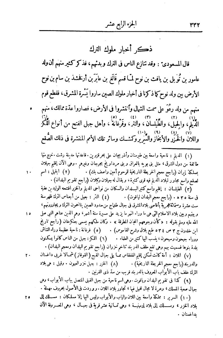 قال المسعودىّ: وقد تنازع الناس فى الترك وبدئهم، فذكر كثير منهم أن ولد عامور بن توبل بن يافث بن نوح لمّا قسم فالغ بن عابر بن أرفخشد بن سام بن نوح الأرض بين ولد نوح كما ذكرنا فى أخبار ملوك الصين ساروا يسرة المشرق، فقطع قوم منهم من ولد رعو على سمت الشمال وانتشروا فى الأرض، فصاروا عدّة ممالك، منهم الدّيلم «1» ، والجيل «2» ، والطّيلسان «3» ، والتتر «4» ، وفرغانة «5» ، وأهل جبل الفتح من أنواع الّلكز «6» واللان «7» والخزر «8» والأبخاز «9» والسّرير «10» وكمشك وسائر تلك الأمم المنتشرة فى ذلك الصّقع