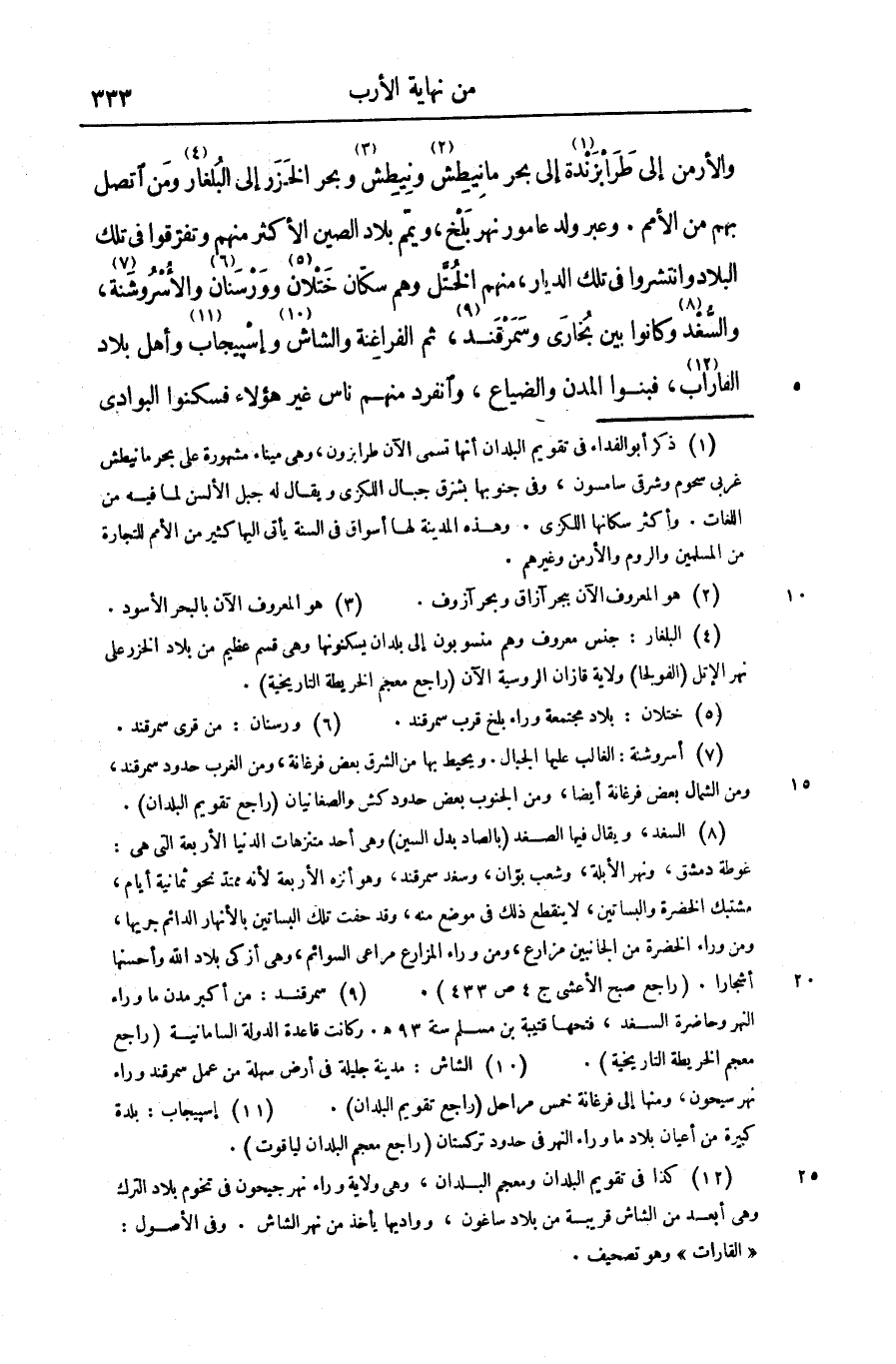 والأرمن إلى طرابزندة «1» إلى بحر مانيطش «2» ونيطش «3» وبحر الخزر إلى البلغار «4» ومن اتصل بهم من الأمم. وعبر ولد عامور نهر بلخ، ويمّم بلاد الصين الأكثر منهم وتفرّقوا فى تلك البلاد وانتشروا فى تلك الديار، منهم الختّل وهم سكّان ختلان «5» وورسنان «6» والأسروشنة «7» ، والسّغد «8» وكانوا بين بخارى وسمرقند «9» ، ثم الفراغنة والشاش «10» وإسپيجاب «11» وأهل بلاد الفاراب «12» ، فبنوا المدن والضياع، وانفرد منهم ناس غير هؤلاء فسكنوا البوادى