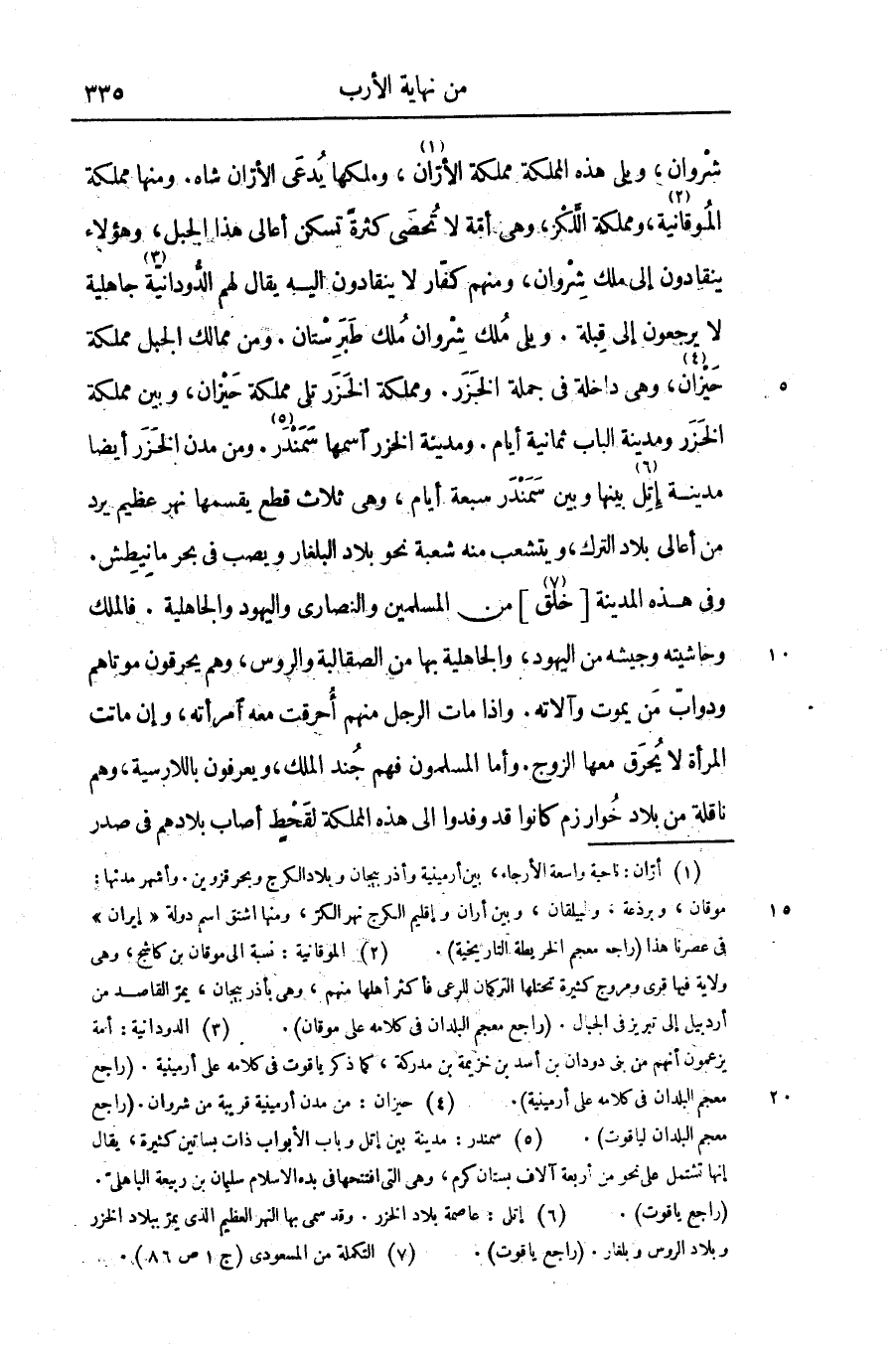 وفى هذه المدينة [خلق «7» ] من المسلمين والنصارى واليهود والجاهلية. فالملك وحاشيته وجيشه من اليهود، والجاهلية بها من الصقالبة والروس، وهم يحرقون موتاهم ودوابّ من يموت وآلاته. واذا مات الرجل منهم أحرقت معه امرأته، وإن ماتت المرأة لا يحرق معها الزوج. وأما المسلمون فهم جند الملك، ويعرفون باللارسية، وهم ناقلة من بلاد خوارزم كانوا قد وفدوا الى هذه المملكة لقحط أصاب بلادهم فى صدر