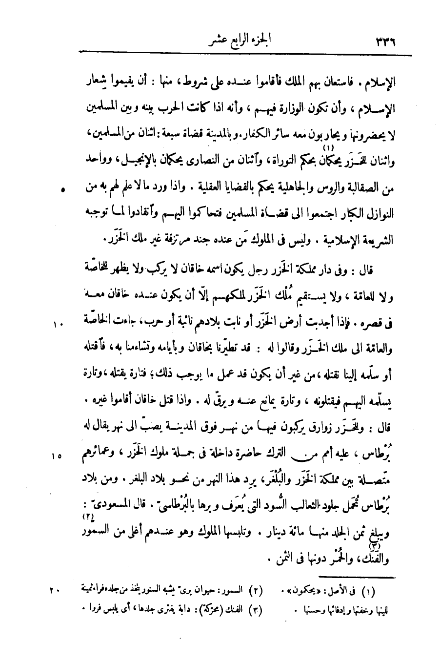 الإسلام. فاستعان بهم الملك فأقاموا عنده على شروط، منها: أن يقيموا شعار الإسلام، وأن تكون الوزارة فيهم، وإنه اذا كانت الحرب بينه وبين المسلمين لا يحضرونها ويحاربون معه سائر الكفار. وبالمدينة قضاة سبعة: اثنان من المسلمين، واثنان للخزر يحكمان «1» بحكم التوراة، واثنان من النصارى يحكمان بالإنجيل، وواحد من الصقالبة والروس والجاهلية يحكم بالقضايا العقلية. واذا ورد ما لا علم لهم به من النوازل الكبار اجتمعوا الى قضاة المسلمين فتحاكموا اليهم وانقادوا لما توجبه الشريعة الإسلامية. وليس فى الملوك من عنده جند مرتزقة غير ملك الخزر.