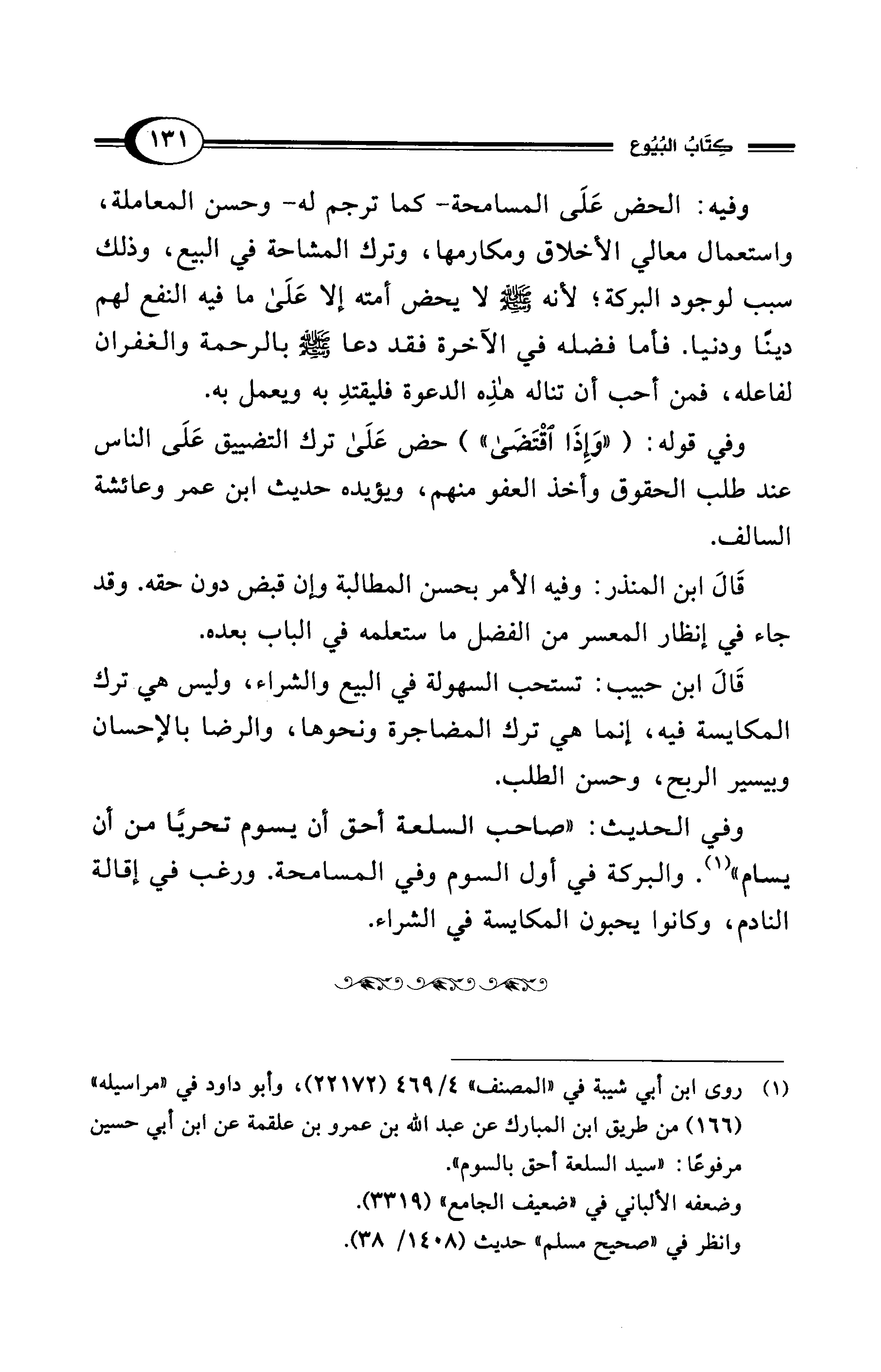 وفيه: الحض عَلَى المسامحة -كما ترجم له- وحسن المعاملة، واستعمال معالي الأخلاق ومكارمها، وترك المشاحة في البيع، وذلك سبب لوجود البركة؛ لأنه - صلى الله عليه وسلم - لا يحض أمته إلا عَلَى ما فيه النفع لهم دينًا ودنيا. فأما فضله في الآخرة فقد دعا - صلى الله عليه وسلم - بالرحمة والغفران لفاعله، فمن أحب أن تناله هذِه الدعوة فليقتدِ به ويعمل به.