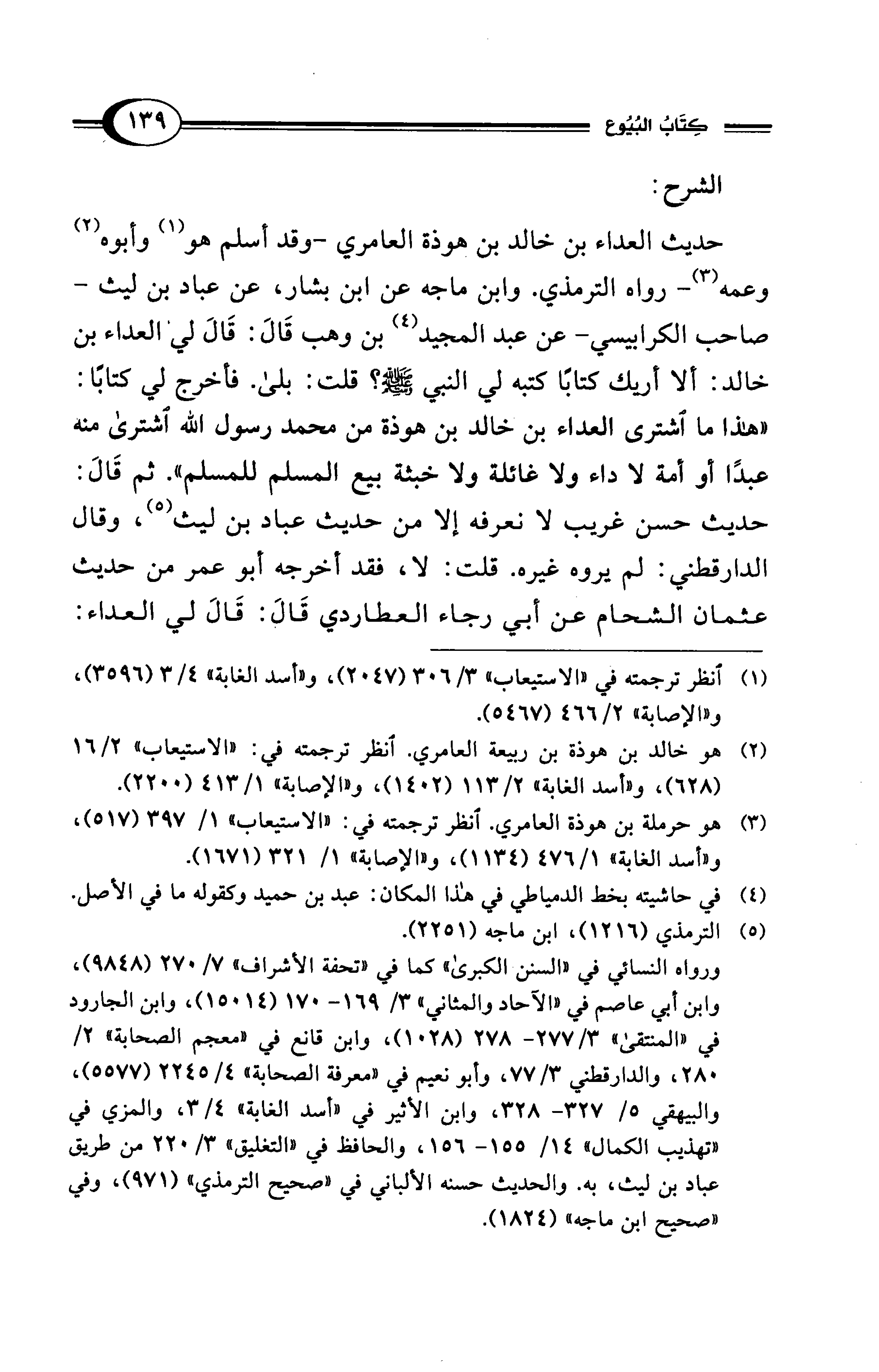 حديث العداء بن خالد بن هوذة العامري -وقد أسلم هو (¬1) وأبوه (¬2) وعمه (¬3) - رواه الترمذي. وابن ماجه عن ابن بشار، عن عباد بن ليث -صاحب الكرابيسي- عن عبد المجيد (¬4) بن وهب قَالَ: قَالَ لي العداء بن خالد: ألا أريك كتابًا كتبه لي النبي - صلى الله عليه وسلم -؟ قلت: بلى. فأخرج لي كتابًا: "هذا ما اشترى العداء بن خالد بن هوذة من محمد رسول الله اشترى منه عبدًا أو أمة لا داء ولا غائلة ولا خبثة بيع المسلم للمسلم". ثم قَالَ: حديث حسن غريب لا نعرفه إلا من حديث عباد بن ليث (¬5)، وقال الدارقطني: لم يروه غيره. قلت: لا، فقد أخرجه أبو عمر من حديث عثمان الشحام عن أبي رجاء العطاردي قَالَي: قَالَ لي العداء: