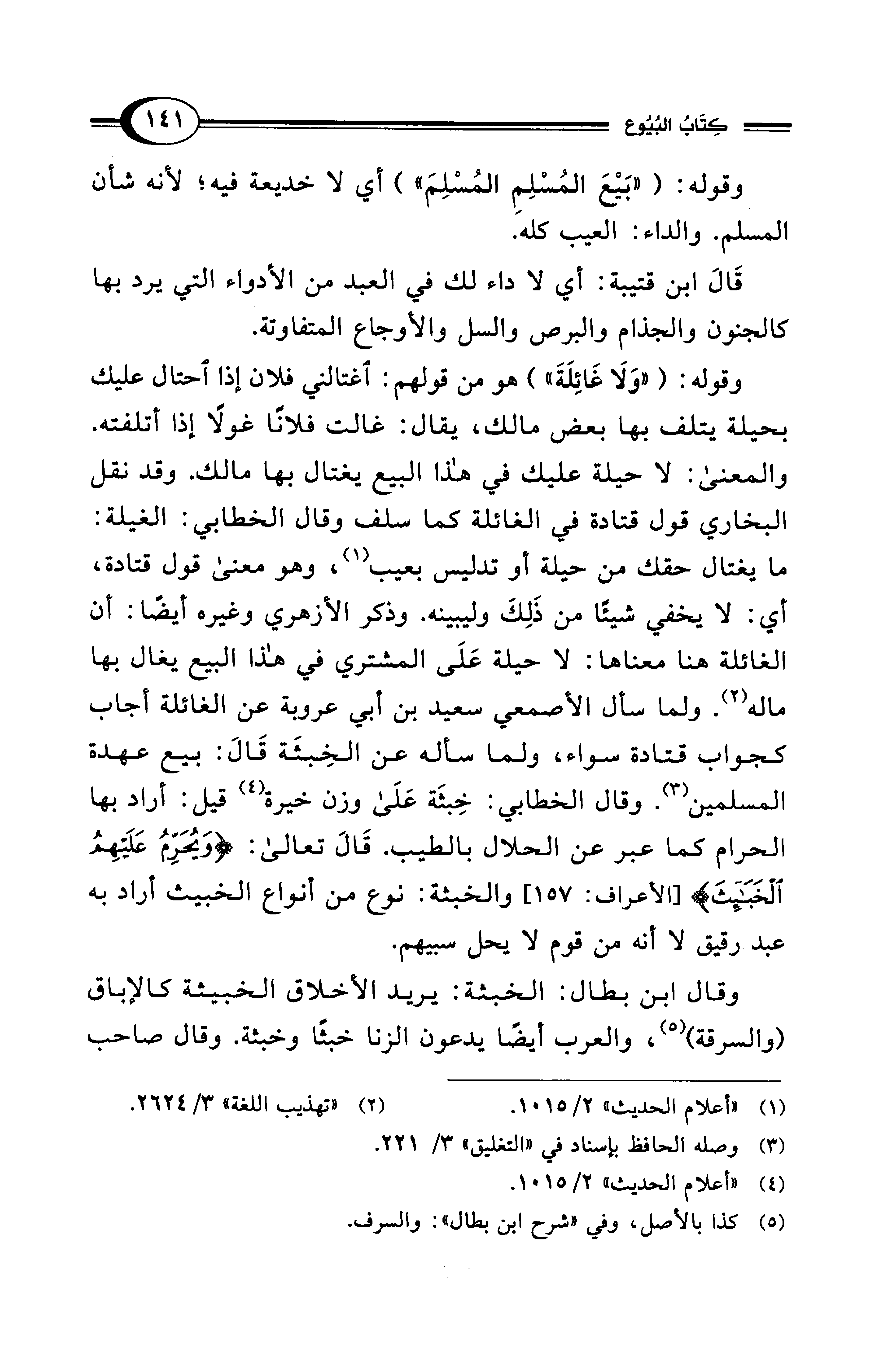 وقوله: ("وَلَا غَائِلَةَ") هو من قولهم: اغتالني فلان إذا احتال عليك بحيلة يتلف بها بعض مالك، يقال: غالت فلانًا غولًا إذا أتلفته. والمعنى: لا حيلة عليك في هذا البيع يغتال بها مالك. وقد نقل البخاري قول قتادة في الغائلة كما سلف وقال الخطابي: الغيلة: ما يغتال حقك من حيلة أو تدليس بعيب (¬1)، وهو معنى قول قتادة، أي: لا يخفي شيئًا من ذَلِكَ وليبينه. وذكر الأزهري وغيره أيضًا: أن الغائلة هنا معناها: لا حيلة عَلَى المشتري في هذا البيع يغال بها ماله (¬2). ولما سأل الأصمعي سعيد بن أبي عروبة عن الغائلة أجاب كجواب قتادة سواء، ولما سأله عن الخِبثَة قَالَ: بيع عهدة المسلمين (¬3). وقال الخطابي: خِبثَة عَلَى وزن خيرة (¬4) قيل: أراد بها الحرام كما عبر عن الحلال بالطيب. قَالَ تعالى: {وَيُحَرِّمُ عَلَيْهِمُ الخَبَائِثَ} [الأعراف: 157] والخبثة: نوع من أنواع الخبيث أراد به عبد رقيق لا أنه من قوم لا يحل سبيهم.