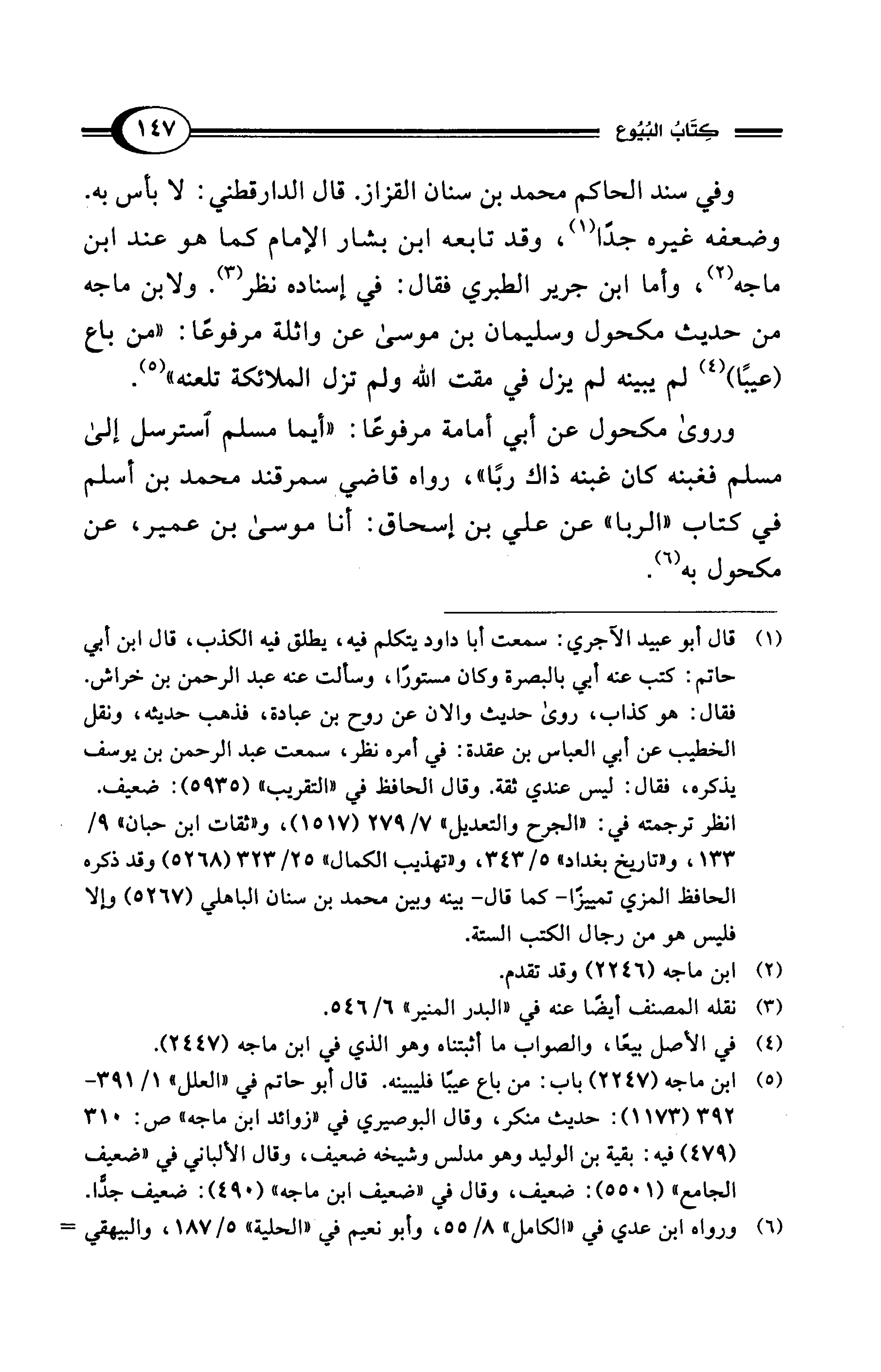 (¬5) ابن ماجه (2247) باب: من باع عيبًا فليبينه. قال أبو حاتم في "العلل" 1/ 391 - 392 (1173): حديث منكر، وقال البوصيري في "زوائد ابن ماجه" ص: 310 (479) فيه: بقية بن الوليد وهو مدلس وشيخه ضعيف، وقال الألباني في "ضعيف الجامع" (5501): ضعيف، وقال في "ضعيف ابن ماجه" (490): ضعيف جدًّا.