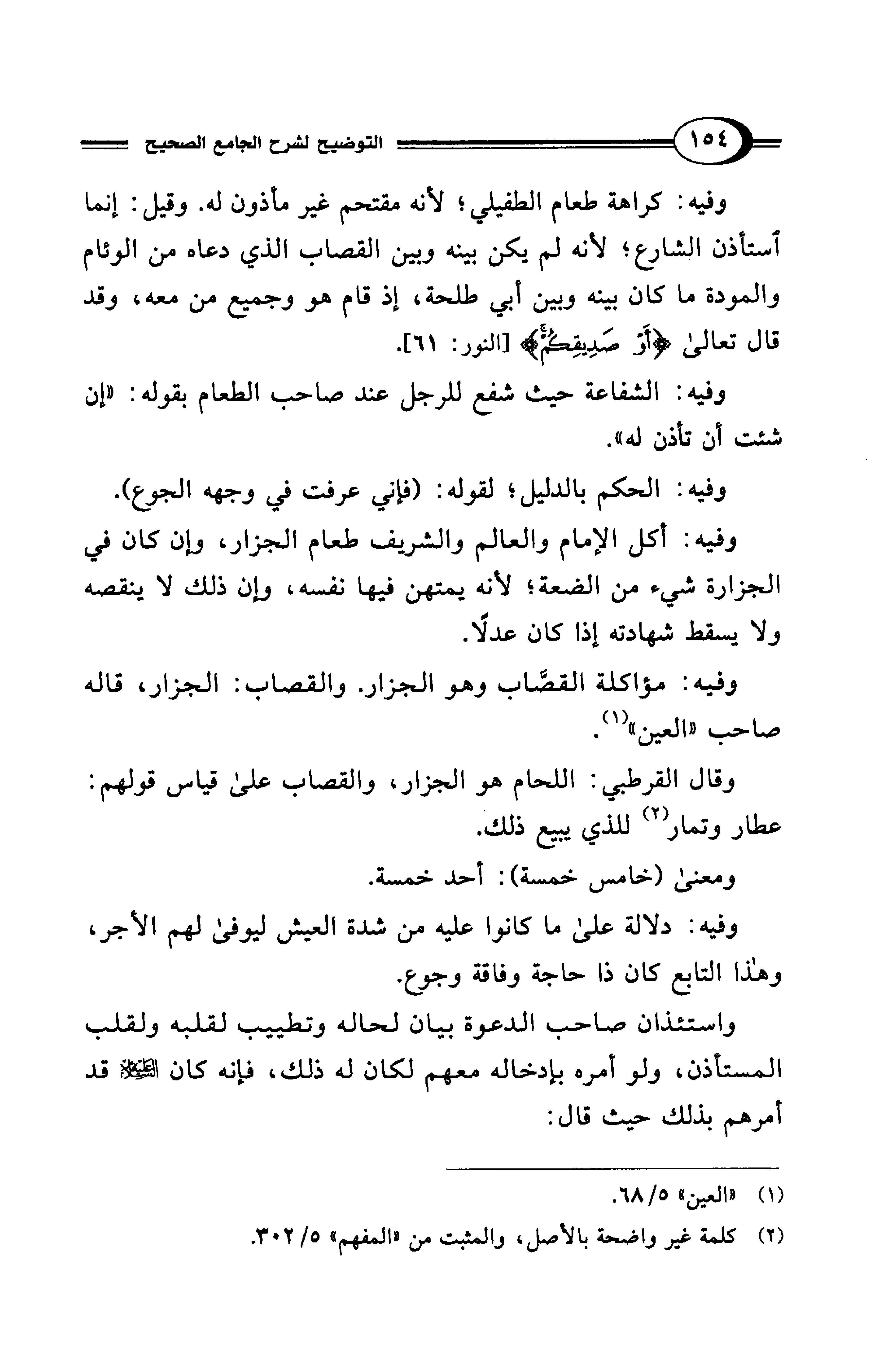 وفيه: كراهة طعام الطفيلي؛ لأنه مقتحم غير مأذون له. وقيل: إنما استاذن الشارع؛ لأنه لم يكن بينه وبين القصاب في دعاه من الوئام والمودة ما كان بينه وبين أبي طلحة، إذ قام هو وجميع من معه، وقد