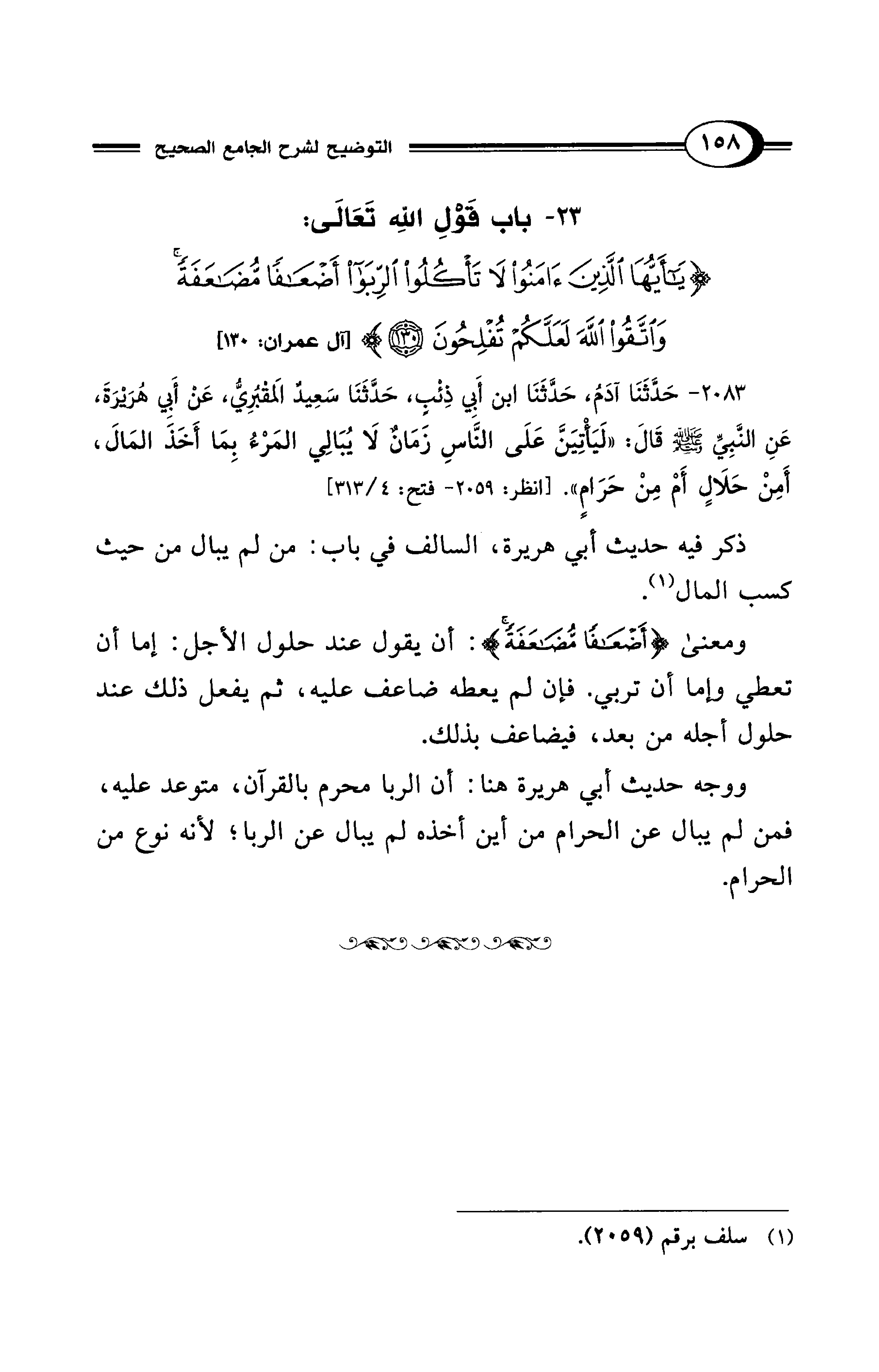 23 - باب قَوْلِ اللهِ تَعَالَى: {يَا أَيُّهَا الَّذِينَ آمَنُوا لَا تَأْكُلُوا الرِّبَا أَضْعَافًا مُضَاعَفَةً وَاتَّقُوا اللَّهَ لَعَلَّكُمْ تُفْلِحُونَ (30)} [آل عمران: 130]