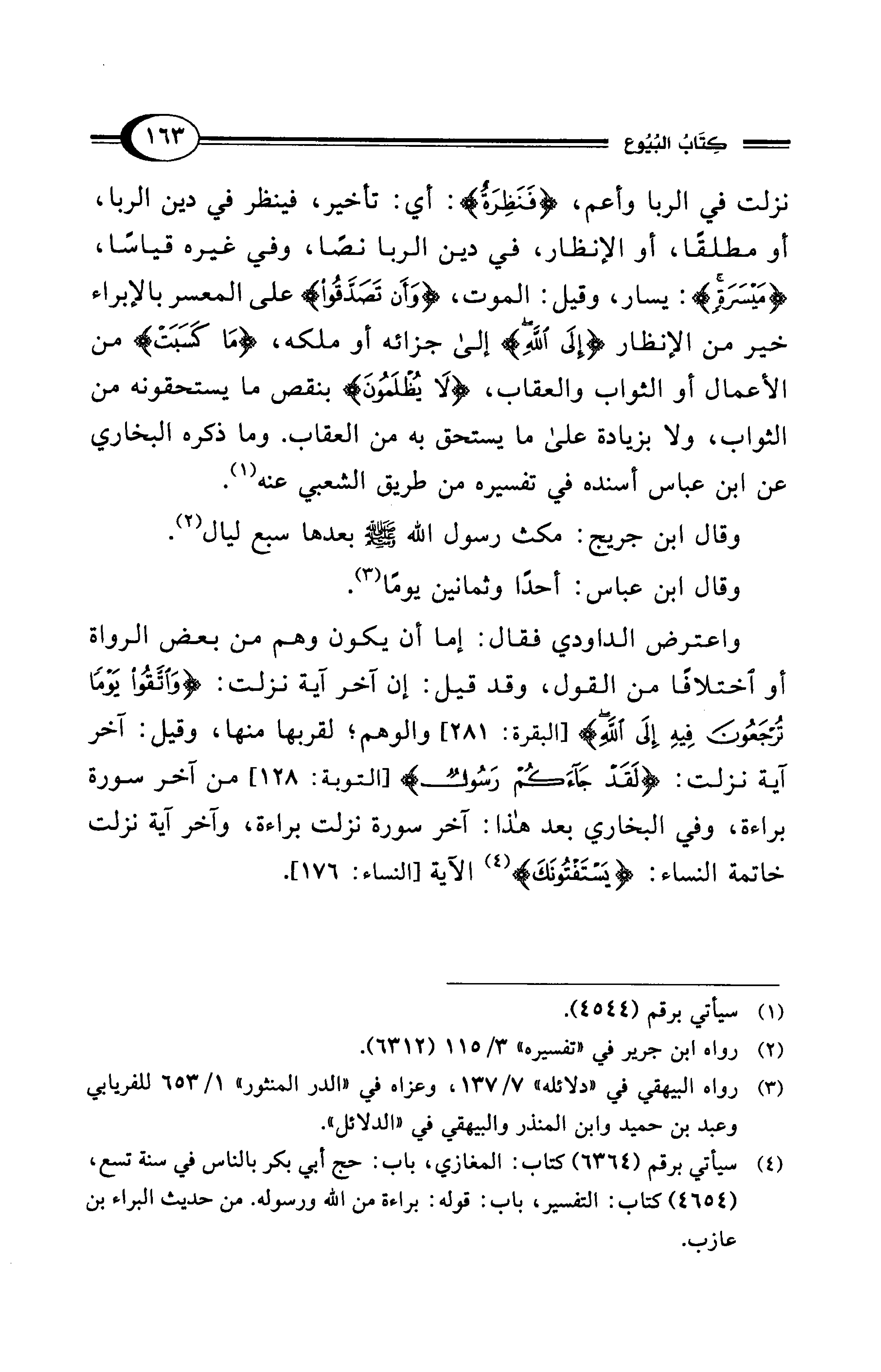 واعترض الداودي فقال: إما أن يكون وهم من بعض الرواة أو اختلافًا من القول، وقد قيل: إن آخر آية نزلت: {وَاتَّقُوا يَومًا تُرجَعُونَ فِيهِ إِلَى اللهِ} [البقرة: 281] والوهم؛ لقربها منها، وقيل: آخر آية نزلت: {لَقَدْ جَاءَكُمْ رَسُولٌ} [التوبة: 128] من آخر سورة براءة، وفي البخاري بعد هذا؛ آخر سورة نزلت براءة، وآخر اية نزلت خاتمة النساء: {يستَفْتُونَكَ} (¬4) الآية [النساء: 176].