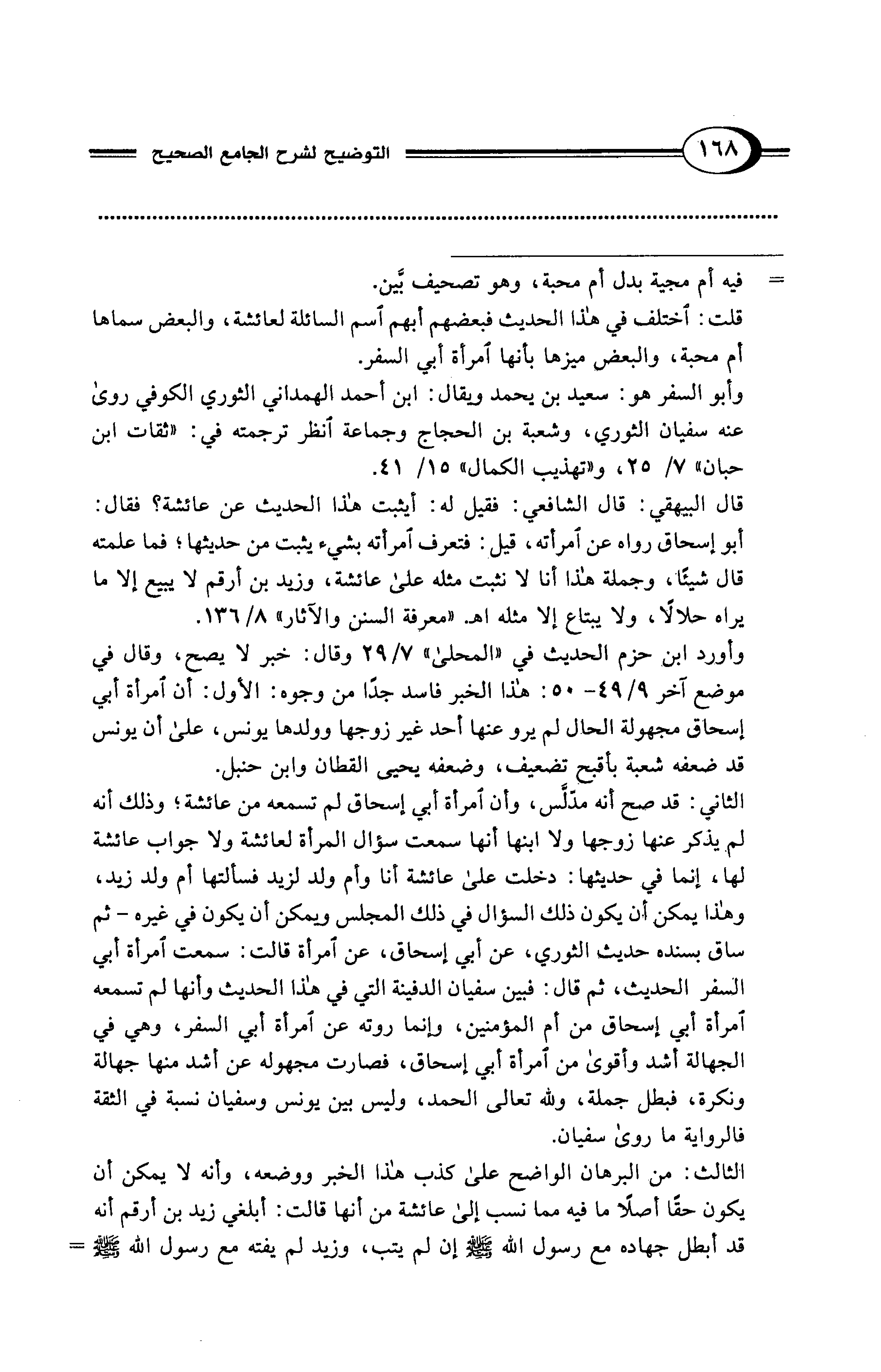 الثاني: قد صح أنه مدّلَّس، وأن امرأة أبي إسحاق لم تسمعه من عائشة؛ وذلك أنه لم يذكر عنها زوجها ولا ابنها أنها سمعت سؤال المرأة لعائشة ولا جواب عائشة لها، إنما في حديثها: دخلت على عائشة أنا وأم ولد لزيد فسألتها أم ولد زيد، وهذا يمكن أبي يكون ذلك السؤال في ذلك المجلس ويمكن أن يكون في غيره- ثم ساق بسنده حديث الثوري، عن أبي إسحاق، عن امرأة قالت: سمعت امرأة أبي السفر الحديث، ثم قال: فبين سفيان الدفينة التي في هذا الحديث وأنها لم تسمعه امرأة أبي إسحاق من أم المؤمنين، وإنما روته عن امرأة أبي السفر، وهي في الجهالة أشد وأقوى من امرأة أبي إسحاق، فصارت مجهوله عن أشد منها جهالة ونكرة، فبطل جملة، ولله تعالى الحمد، وليس بين يونس وسفيان نسبة في الثقة فالرواية ما روى سفيان.