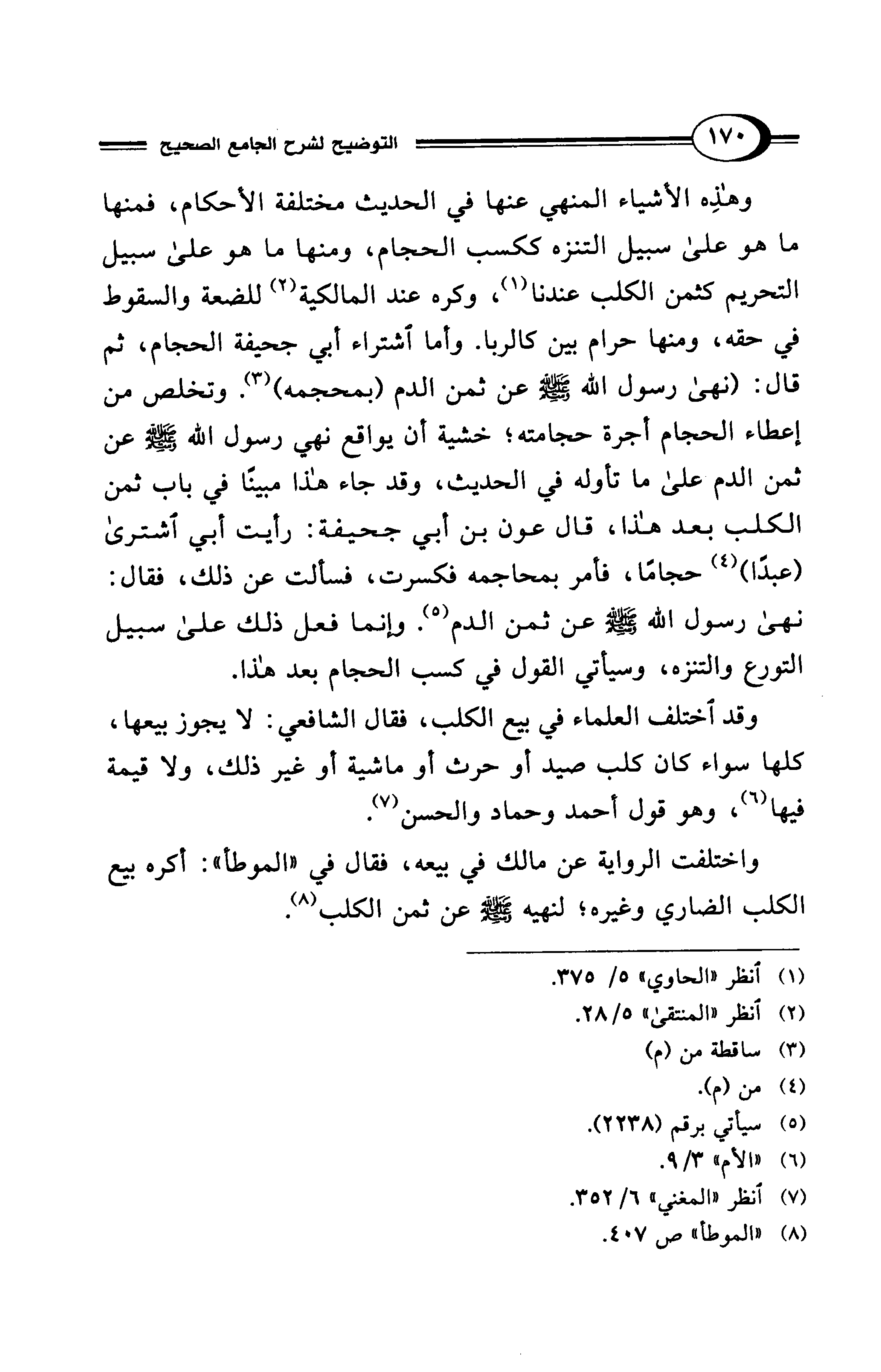 وهذِه الأشياء المنهي عنها في الحديث مختلفة الأحكام، فمنها ما هو على سبيل التنزه ككسب الحجام، ومنها ما هو على سبيل التحريم كثمن الكلب عندنا (¬1)، وكره عند المالكية (¬2) للضعة والسقوط في حقه، ومنها حرام بين كالربا. وأما اشتراء أبي جحيفة الحجام، ثم قال: (نهى رسول الله - صلى الله عليه وسلم - عن ثمن الدم (بمحجمه) (¬3). وتخلص من إعطاء الحجام أجرة حجامته؛ خشية أن يواقع نهي رسول الله - صلى الله عليه وسلم - عن ثمن الدم على ما تأوله في الحديث، وقد جاء هذا مبينًا في باب ثمن الكلب بعد هذا، قال عون بن أبي جحيفة: رأيت أبي اشترى (عبدًا) (¬4) حجامًا، فأمر بمحاجمه فكسرت، فسألت عن ذلك، فقال: نهى رسول الله - صلى الله عليه وسلم - عن ثمن الدم (¬5). وإنما فعل ذلك على سبيل التورع والتنزه، وسيأتي القول في كسب الحجام بعد هذا.