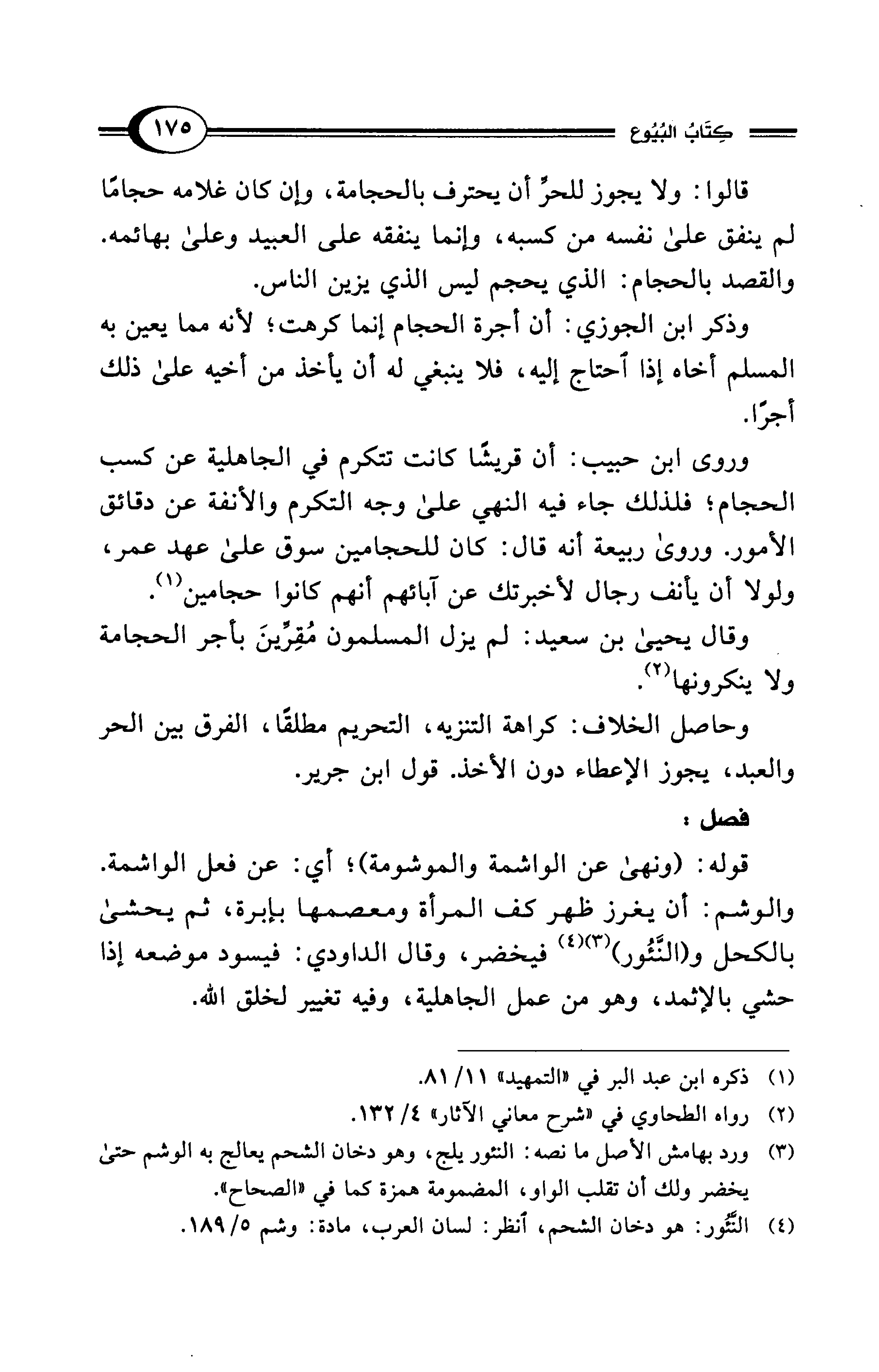 قالوا: ولا يجوز للحرِّ أن يحترف بالحجامة، وإن كان غلامه حجامًا لم ينفق على نفسه من كسبه، وإنما ينفقه على العبيد وعلى بهائمه. والقصد بالحجام: في يحجم ليس في يزين الناس.
