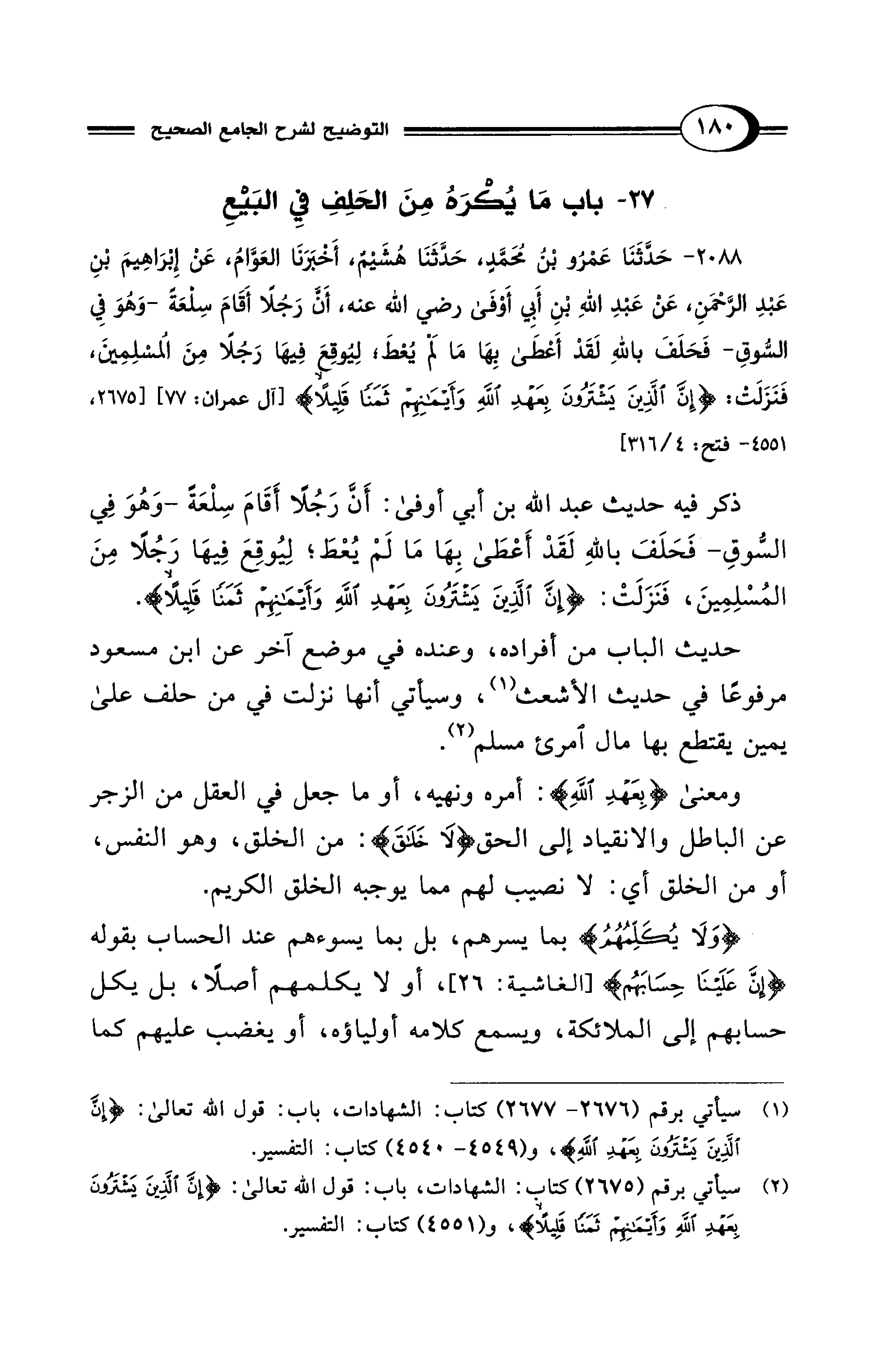 ذكر فيه حديث عبد الله بن أبي أوفى: أَن رَجُلًا أَقَامَ سِلْعَةً -وَهُوَ فِي السُّوقِ- فَحَلَفَ بالله لَقَدْ أَعْطَى بِهَا مَا لَمْ يُعْطَ؛ لِيُوقِعَ فِيهَا رَجُلًا مِنَ المُسْلِمِينَ، فَنَزَلَتْ: {إِنَّ الَّذِينَ يَشْتَرُونَ بِعَهْدِ اللهِ وَأَيْمَانِهِمْ ثَمَنًا قَلِيلًا}.