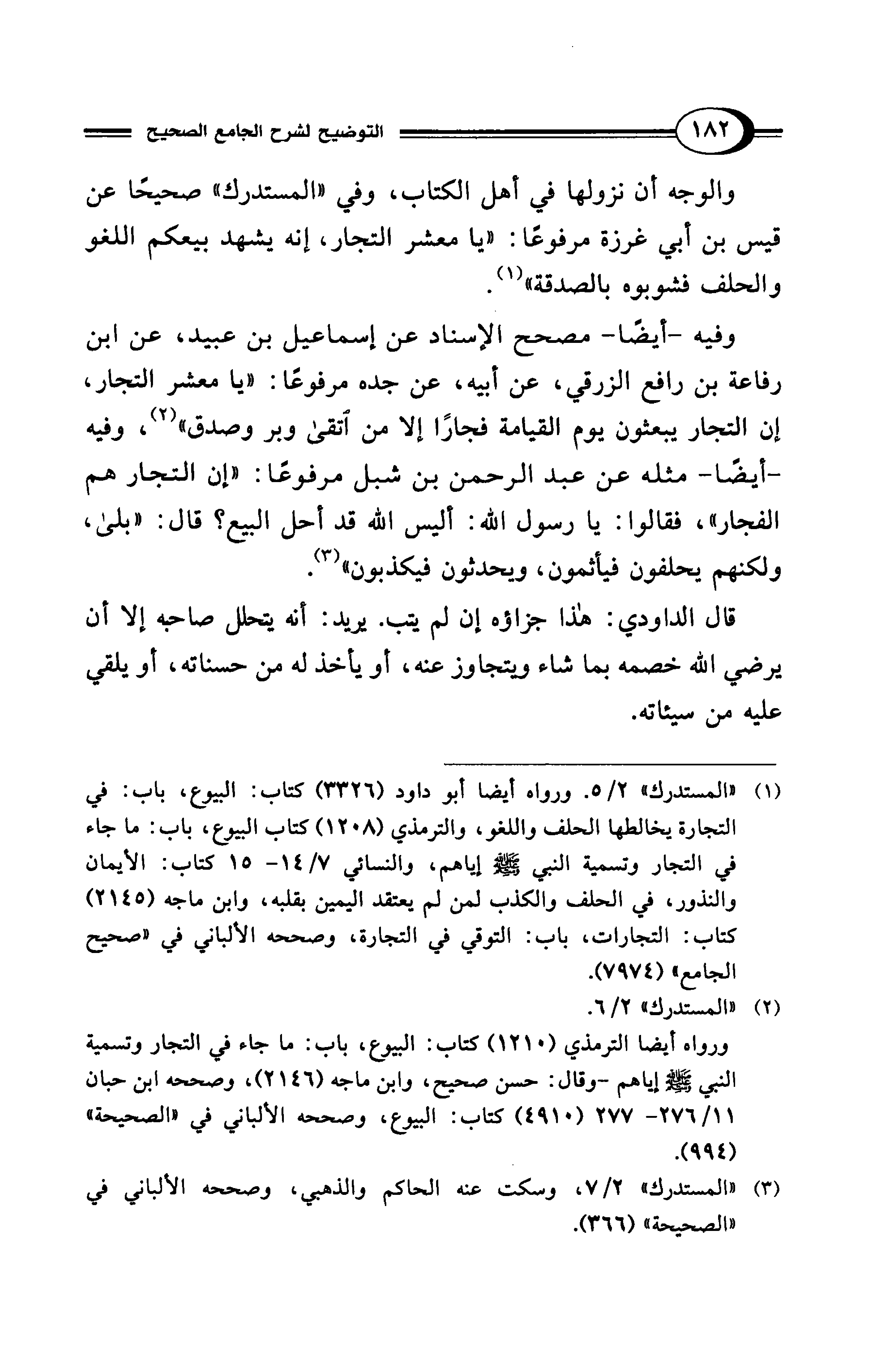(¬1) "المستدرك" 2/ 5. ورواه أيضًا أبو داود (3326) كتاب: البيوع، باب: في التجارة يخالطها الحلف واللغو، والترمذي (1208) كتاب البيوع، باب: ما جاء في التجار وتسمية النبي - صلى الله عليه وسلم - إياهم، والنسائي 7/ 14 - 15 كتاب: الإيمان والنذور، في الحلف والكذب لمن لم يعتقد اليمين بقلبه، وابن ماجه (2145) كتاب: التجارات، باب: التوقي في التجارة، وصححه الألباني في "صحيح الجامع" (7974).