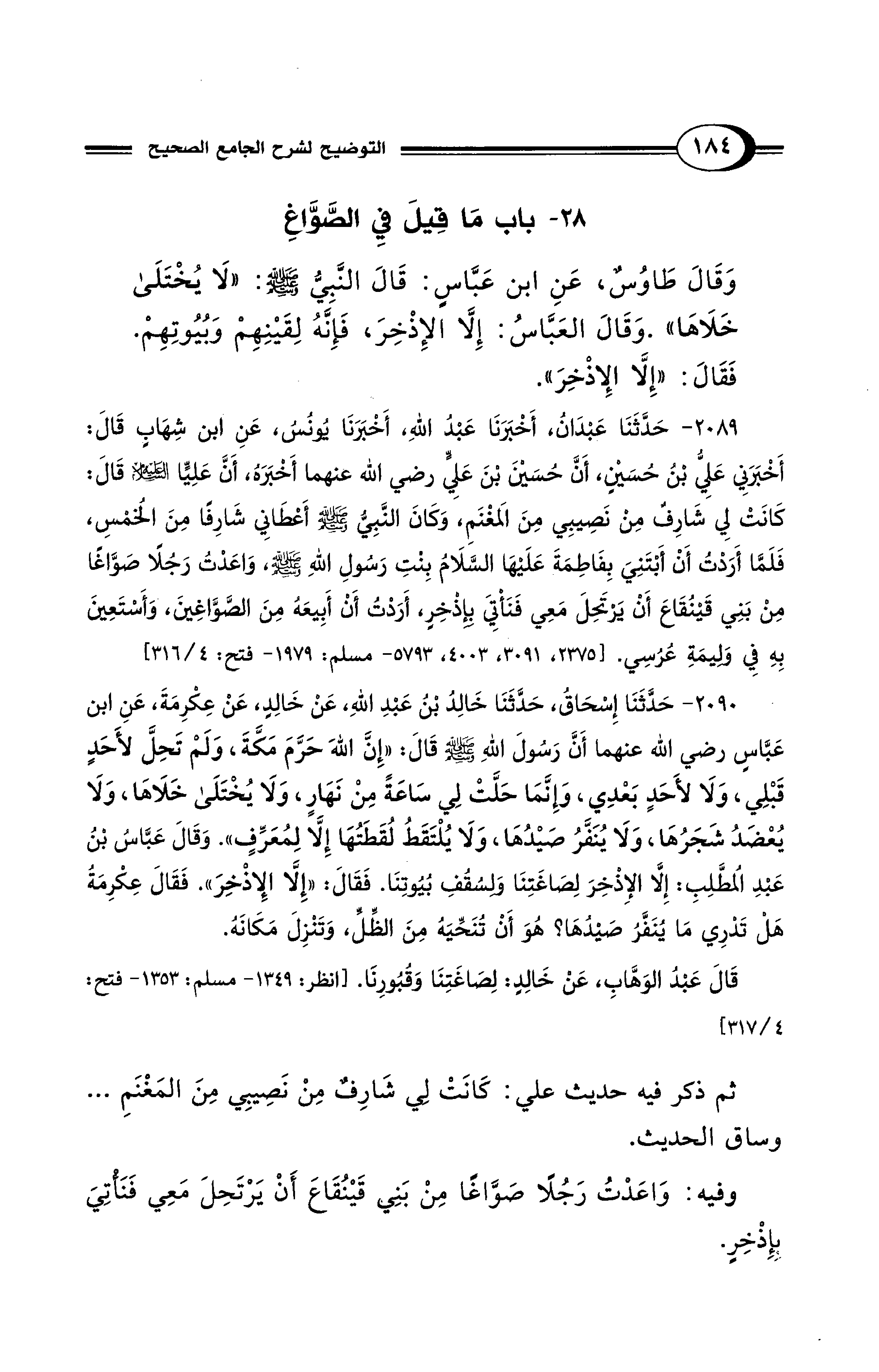 2089 - حَدَّثَنَا عَبْدَانُ، أَخْبَرَنَا عَبْدُ اللهِ، أَخْبَرَنَا يُونُسُ، عَنِ ابْنِ شِهَابٍ قَالَ: أَخْبَرَنِي عَلِيُّ بْنُ حُسَيْنٍ، أَنَّ حُسَيْنَ بْنَ عَلِيٍّ رضي الله عنهما أَخْبَرَهُ، أَنَّ عَلِيًّا - عليه السلام - قَالَ: كَانَتْ لِي شَارِفٌ مِنْ نَصِيبِي مِنَ المَغْنَمِ، وَكَانَ النَّبِيُّ - صلى الله عليه وسلم - أَعْطَانِي شَارِفًا مِنَ الخُمْسِ، فَلَمَّا أَرَدْتُ أَنْ أَبْتَنِىَ بِفَاطِمَةَ عَلَيْهَا السَّلاَمُ بِنْتِ رَسُولِ اللهِ - صلى الله عليه وسلم -، وَاعَدْتُ رَجُلًا صَوَّاغًا مِنْ بَنِي قَيْنُقَاعَ أَنْ يَرْتَحِلَ مَعِي فَنَأْتِيَ بِإِذْخِرٍ، أَرَدْتُ أَنْ أَبِيعَهُ مِنَ الصَّوَّاغِينَ، وَأَسْتَعِينَ بِهِ فِي وَلِيمَةِ عُرُسِي. [2375، 3091، 4003، 5793 - مسلم: 1979 - فتح: 4/ 316]