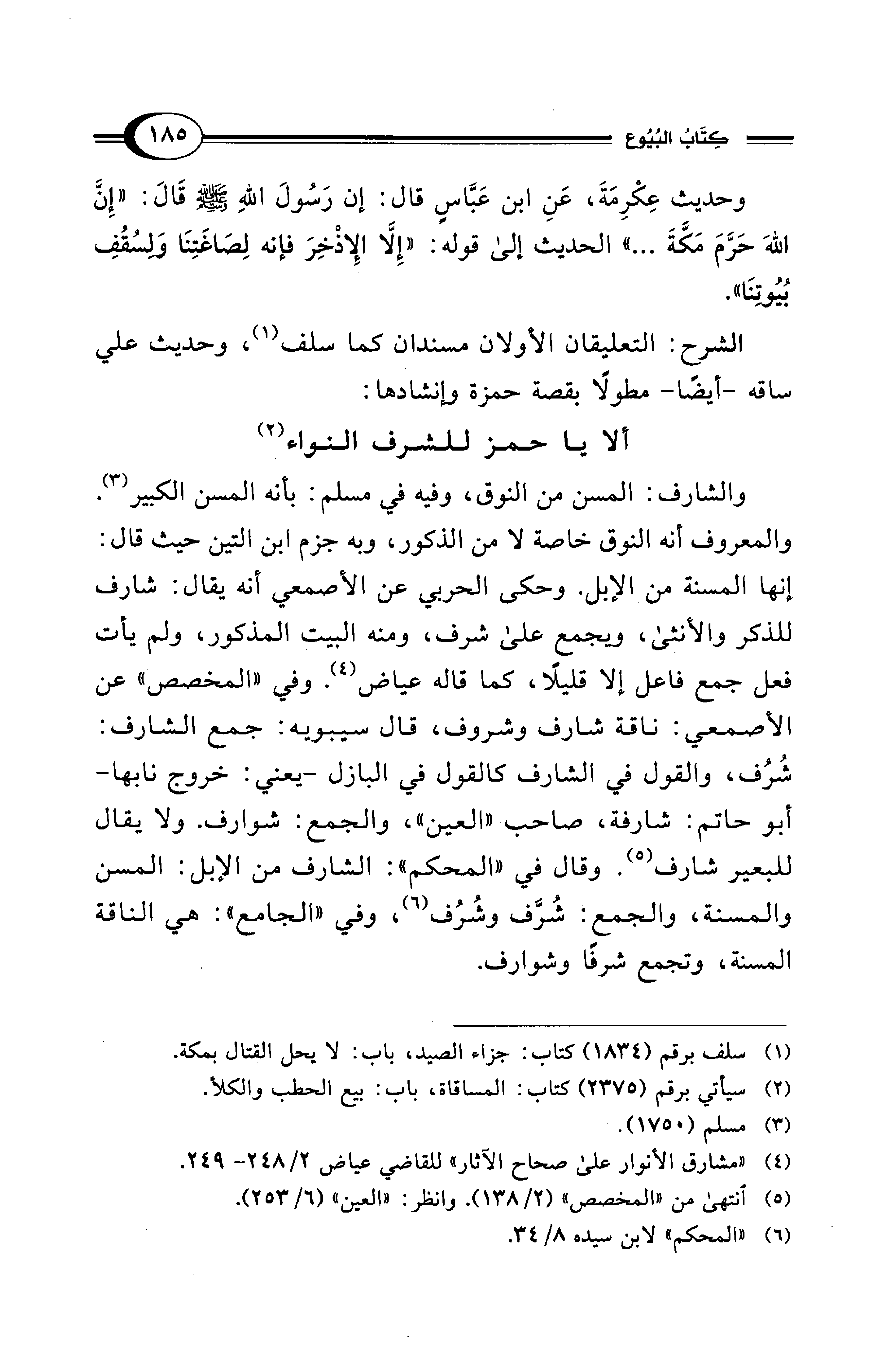 والشارف: المسن من النوق، وفيه في مسلم: بأنه المسن الكبير (¬3). والمعروف أنه النوق خاصة لا من الذكور، وبه جزم ابن التين حيث قال: إنها المسنة من الإبل. وحكى الحربي عن الأصمعي أنه يقال: شارف للذكر والأنثى، ويجمع على شرف، ومنه البيت المذكور، ولم يأت فعل جمع فاعل إلا قليلًا، كما قاله عياض (¬4). وفي "المخصص" عن الأصمعي: ناقة شارف وشروف، قال سيبويه: جمع الشاوف: شُرُف، والقول في الشارف كالقول في البازل -يعني: خروج نابها- أبو حاتم: شارفة، صاحب "العين"، والجمع: شوارف. ولا يقال للبعير شارف (¬5). وقال في "المحكم": الشارف من الإبل: المسن والمسنة، والجمع: شُرَّف وشُرُف (¬6)، وفي "الجامع": هي الناقة المسنة، وتجمع شرفًا وشوارف.