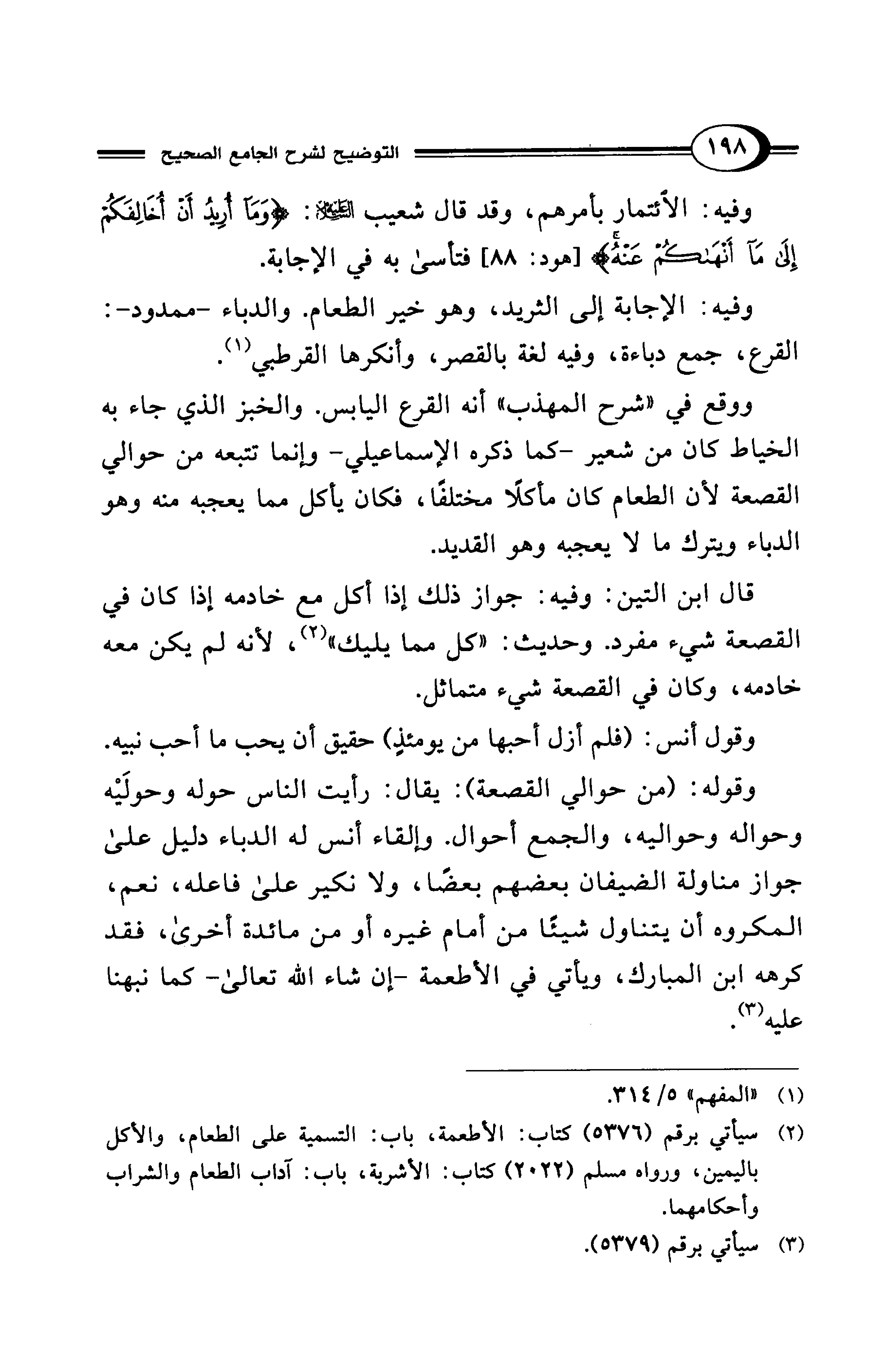 وقوله: (من حوالي القصعة): يقال: رأيت الناس حوله وحولَيْه وحواله وحواليه، والجمع أحوال. وإلقاء أنس له الدباء دليل على جواز مناولة الضيفان بعضهم بعضًا، ولا نكير على فاعله، نعم، المكروه أن يتناول شيئًا من أمام غيره أو من مائدة أخرى، فقد كرهه ابن المبارك، ويأتي في الأطعمة -إن شاء الله تعالى- كما نبهنا عليه (¬3).