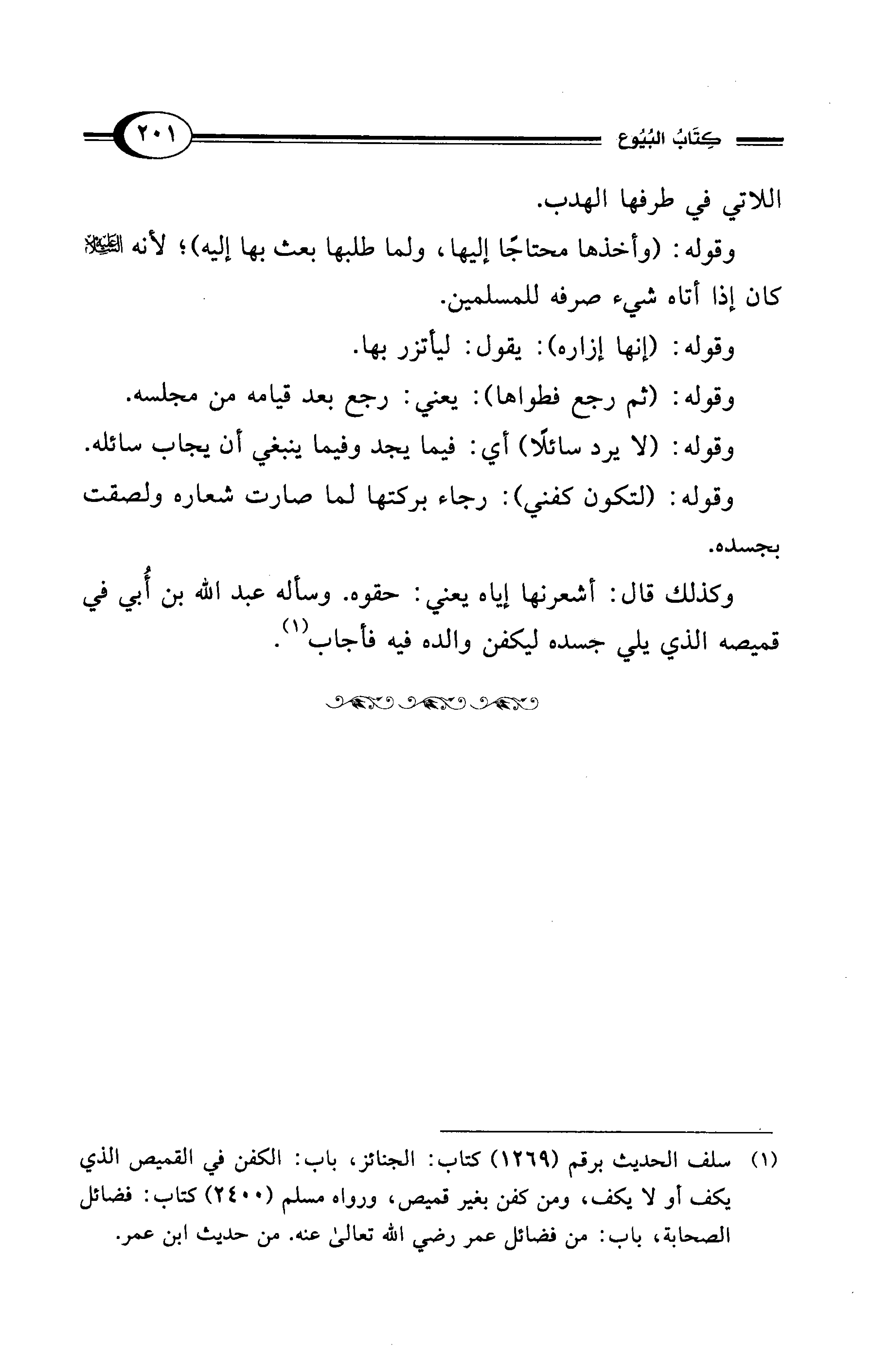 (¬1) سلف الحديث برقم (1269) كتاب: الجنائز، باب: الكفن في القميص الذي يكف أو لا يكف، ومن كفن بغير قميص، ورواه مسلم (2400) كتاب: فضائل الصحابة، باب: من فضائل عمر رضي الله تعالى عنه. من حديث ابن عمر.
