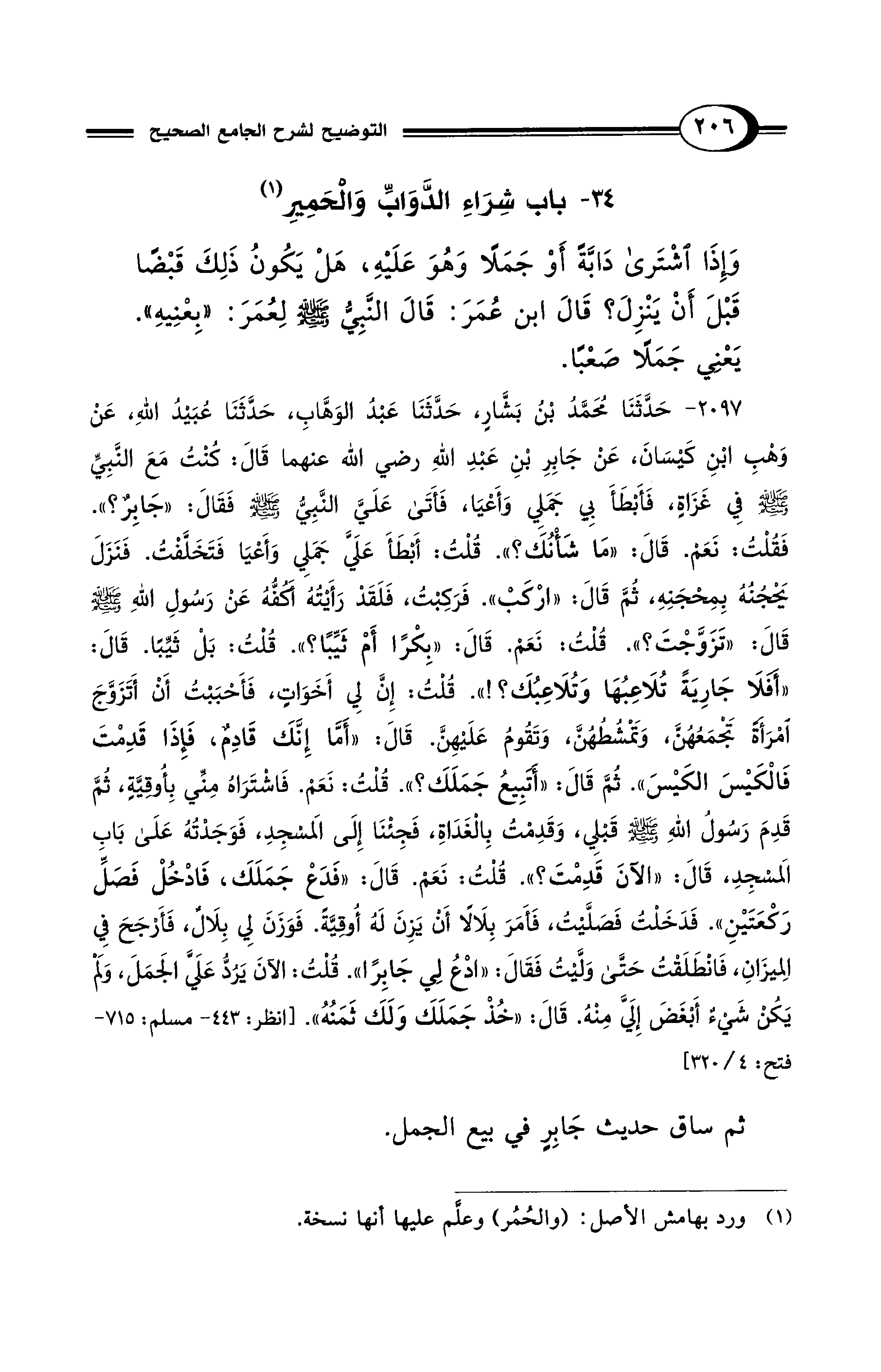 2097 - حَدَّثَنَا مُحَمَّدُ بْنُ بَشَّارٍ، حَدَّثَنَا عَبْدُ الوَهَّابِ، حَدَّثَنَا عُبَيْدُ اللهِ، عَنْ وَهْبِ بْنِ كَيْسَانَ، عَنْ جَابِرِ بْنِ عَبْدِ اللهِ رضي الله عنهما قَالَ: كُنْتُ مَعَ النَّبِيِّ - صلى الله عليه وسلم - فِي غَزَاةٍ، فَأَبْطَأَ بِي جَمَلِي وَأَعْيَا، فَأَتَى عَلَيَّ النَّبِيُّ - صلى الله عليه وسلم - فَقَالَ: "جَابِرٌ؟ ". فَقُلْتُ: نَعَمْ. قَالَ: "مَا شَأْنُكَ؟ ". قُلْتُ: أَبْطَأَ عَلَيَّ جَمَلِي وَأَعْيَا فَتَخَلَّفْتُ. فَنَزَلَ يَحْجُنُهُ بِمِحْجَنِهِ، ثُمَّ قَالَ: "ارْكَبْ". فَرَكِبْتُ، فَلَقَدْ رَأَيْتُهُ أَكُفُّهُ عَنْ رَسُولِ اللهِ - صلى الله عليه وسلم - قَالَ: "تَزَوَّجْتَ؟ ". قُلْتُ: نَعَمْ. قَالَ: "بِكْرًا أَمْ ثَيِّبًا؟ ". قُلْتُ: بَلْ ثَيِّبًا. قَالَ: "أَفَلاَ جَارِيَةً تُلاَعِبُهَا وَتُلاَعِبُكَ؟! ". قُلْتُ: إِنَّ لِي أَخَوَاتٍ، فَأَحْبَبْتُ أَنْ أَتَزَوَّجَ امْرَأَةً تَجْمَعُهُنَّ، وَتَمْشُطُهُنَّ، وَتَقُومُ عَلَيْهِنَّ. قَالَ: "أَمَّا إِنَّكَ قَادِمٌ، فَإِذَا قَدِمْتَ فَالكَيْسَ الكَيْسَ". ثُمَّ قَالَ: "أَتَبِيعُ جَمَلَكَ؟ ". قُلْتُ نَعَمْ. فَاشْتَرَاهُ مِنِّي بِأُوقِيَّةٍ، ثُمَّ قَدِمَ رَسُولُ اللهِ - صلى الله عليه وسلم - قَبْلِي، وَقَدِمْتُ بِالغَدَاةِ، فَجِئْنَا إِلَى المَسْجِدِ، فَوَجَدْتُهُ عَلَى بَابِ المَسْجِدِ، قَالَ: "الآنَ قَدِمْتَ؟ ". قُلْتُ: نَعَمْ. قَالَ: "فَدَعْ جَمَلَكَ، فَادْخُلْ فَصَلِّ رَكْعَتَيْنِ". فَدَخَلْتُ فَصَلَّيْتُ، فَأَمَرَ بِلاَلًا أَنْ يَزِنَ لَهُ أُوقِيَّةً. فَوَزَنَ لِي بِلاَلٌ، فَأَرْجَحَ فِي المِيزَانِ، فَانْطَلَقْتُ حَتَّى وَلَّيْتُ فَقَالَ: "ادْعُ لِي جَابِرًا". قُلْتُ: الآنَ يَرُدُّ عَلَيَّ الجَمَلَ، وَلَمْ يَكُنْ شَيْءٌ أَبْغَضَ إِلَيَّ مِنْهُ. قَالَ: "خُذْ جَمَلَكَ وَلَكَ ثَمَنُهُ". [انظر: 443 - مسلم: 715 - فتح: 4/ 320]