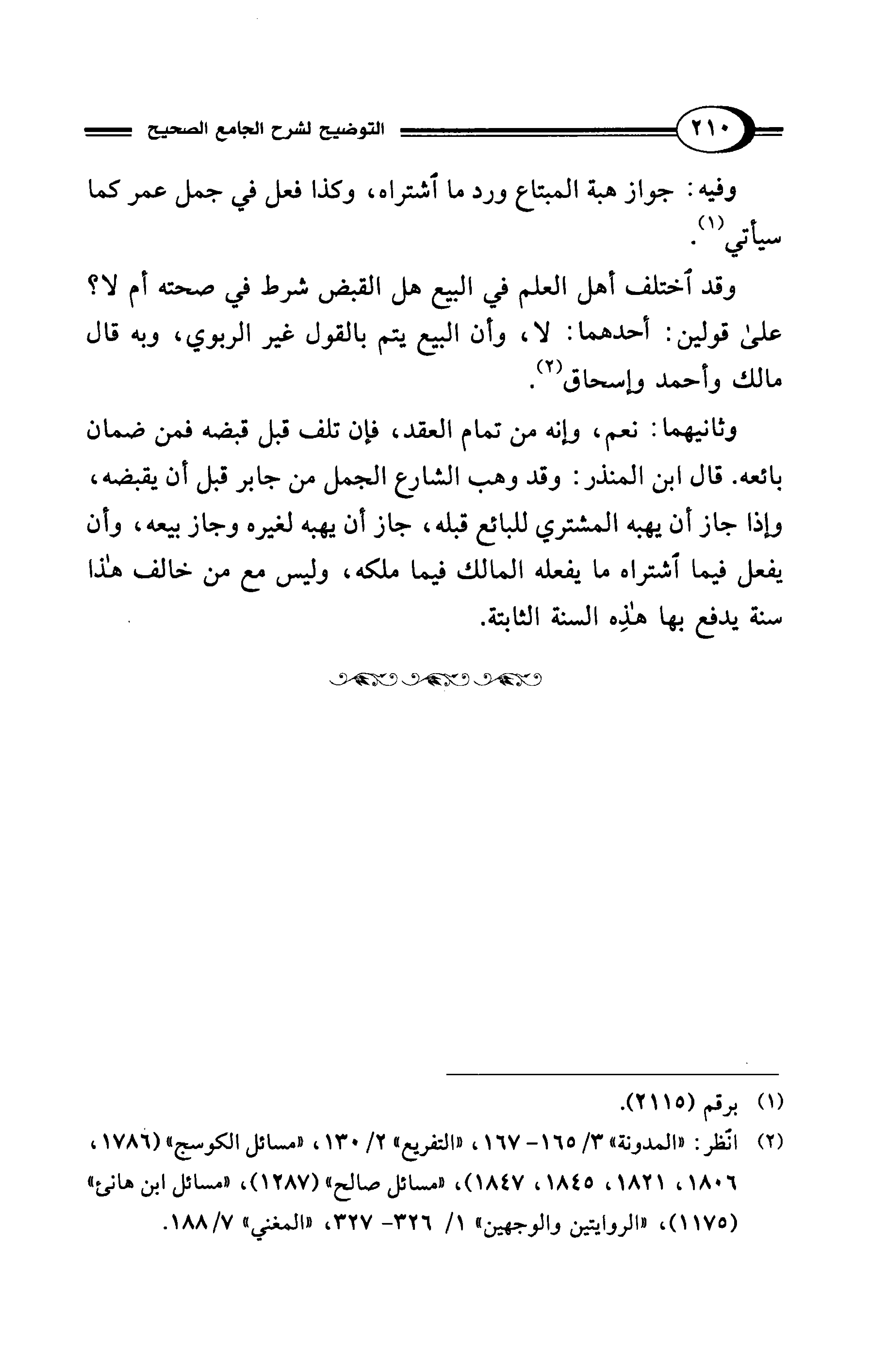 وثانيهما: نعم، وإنه من تمام العقد، فإن تلف قبل قبضه فمن ضمان بائعه. قال ابن المنذر: وقد وهب الشارع الجمل من جابر قبل أن يقبضه، وإذا جاز أن يهبه المشتري للبائع قبله، جاز أن يهبه لغيره وجاز بيعه، وأن يفعل فيما اشتراه ما يفعله المالك فيما ملكه، وليس مع من خالف هذا سنة يدفع بها هذِه السنة الثابتة.