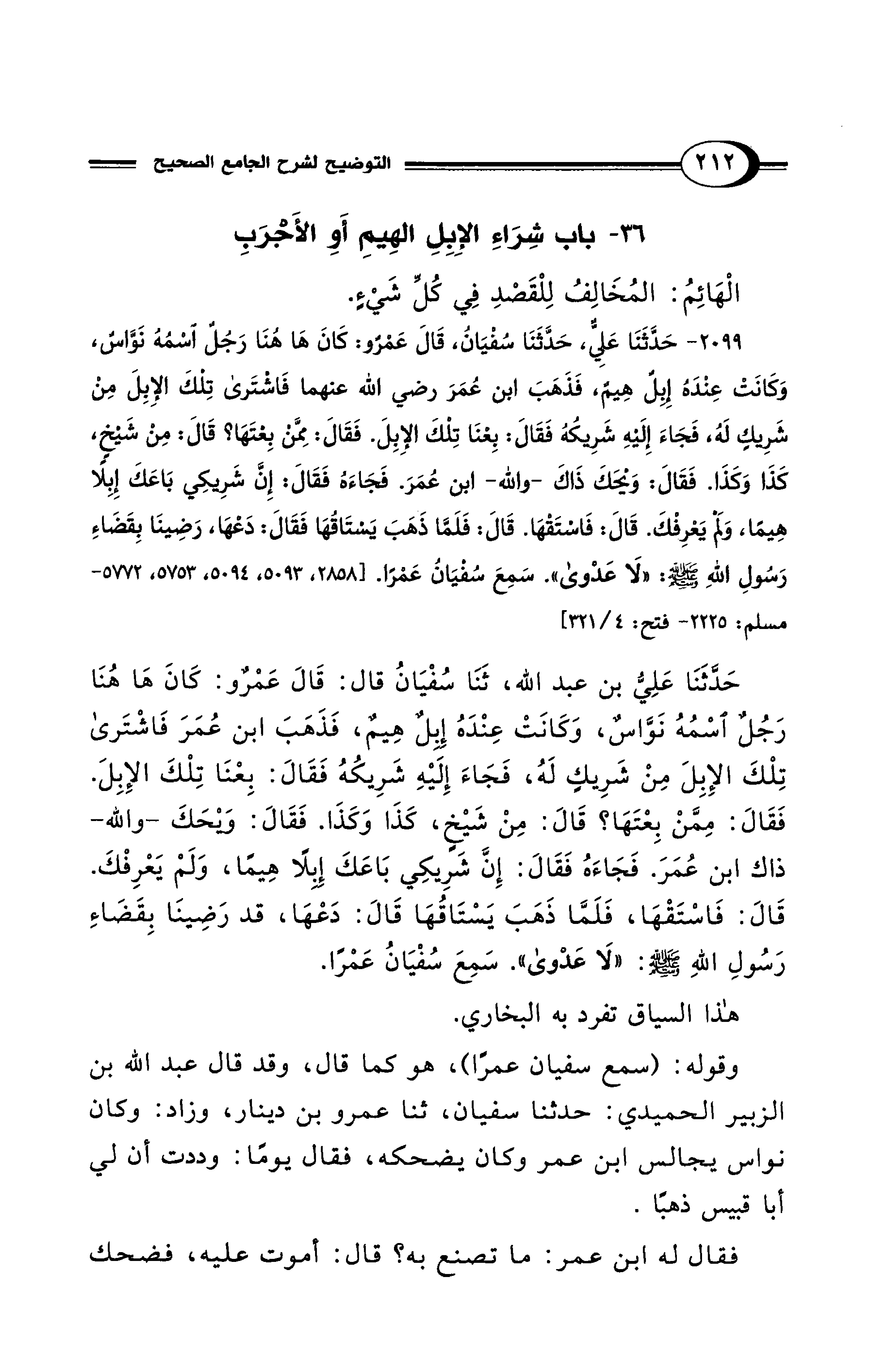 2099 - حَدَّثَنَا عَلِيٌّ، حَدَّثَنَا سُفْيَانُ، قَالَ عَمْرٌو: كَانَ هَا هُنَا رَجُلٌ اسْمُهُ نَوَّاسٌ، وَكَانَتْ عِنْدَهُ إِبِلٌ هِيمٌ، فَذَهَبَ ابْنُ عُمَرَ رضي الله عنهما فَاشْتَرَى تِلْكَ الإِبِلَ مِنْ شَرِيكٍ لَهُ، فَجَاءَ إِلَيْهِ شَرِيكُهُ فَقَالَ: بِعْنَا تِلْكَ الإِبِلَ. فَقَالَ: مِمَّنْ بِعْتَهَا؟ قَالَ: مِنْ شَيْخٍ، كَذَا وَكَذَا. فَقَالَ: وَيْحَكَ ذَاكَ -وَاللهِ- ابْنُ عُمَرَ. فَجَاءَهُ فَقَالَ: إِنَّ شَرِيكِي بَاعَكَ إِبِلًا هِيمًا، وَلَمْ يَعْرِفْكَ. قَالَ: فَاسْتَقْهَا. قَالَ: فَلَمَّا ذَهَبَ يَسْتَاقُهَا فَقَالَ: دَعْهَا، رَضِينَا بِقَضَاءِ رَسُولِ اللهِ - صلى الله عليه وسلم -: "لَا عَدْوَى". سَمِعَ سُفْيَانُ عَمْرًا. [2858، 5093، 5094، 5772 - مسلم: 2225 - فتح: 4/ 321]