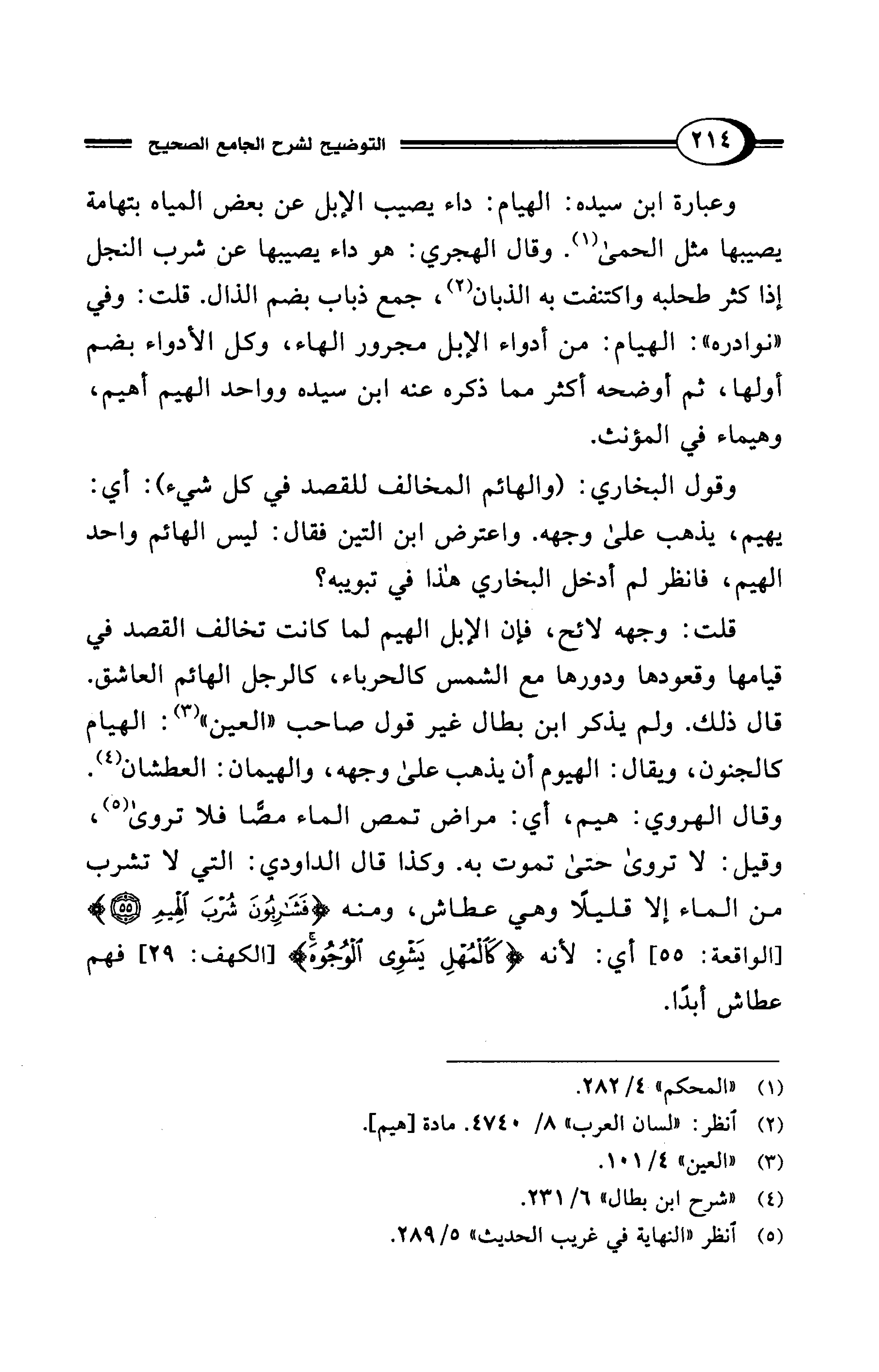 قلت: وجهه لائح، فإن الإبل الهيم لما كانت تخالف القصد في قيامها وقعودها ودورها مع الشمس كالحرباء، كالرجل الهائم العاشق. قال ذلك. ولم يذكر ابن بطال غير قول صاحب "العين" (¬3): الهيام كالجنون، ويقال: الهيوم أن يذهب على وجهه، والهيمان: العطشان (¬4). وقال الهروي: هيم، أي: مراض تمص الماء مصًّا فلا تروى (¬5)، وقيل: لا تروى حتى تموت به. وكذا قال الداودي: التي لا تشرب من الماء إلا قليلًا وهي عطاش، ومنه {فَشَارِبُونَ شُرْبَ الْهِيمِ (55)} [الواقعة: 55] أي: لأنه {كَالمُهْلِ يَشْوِي الوُجُوهَ} [الكهف: 29] فهم عطاش أبدًا.
