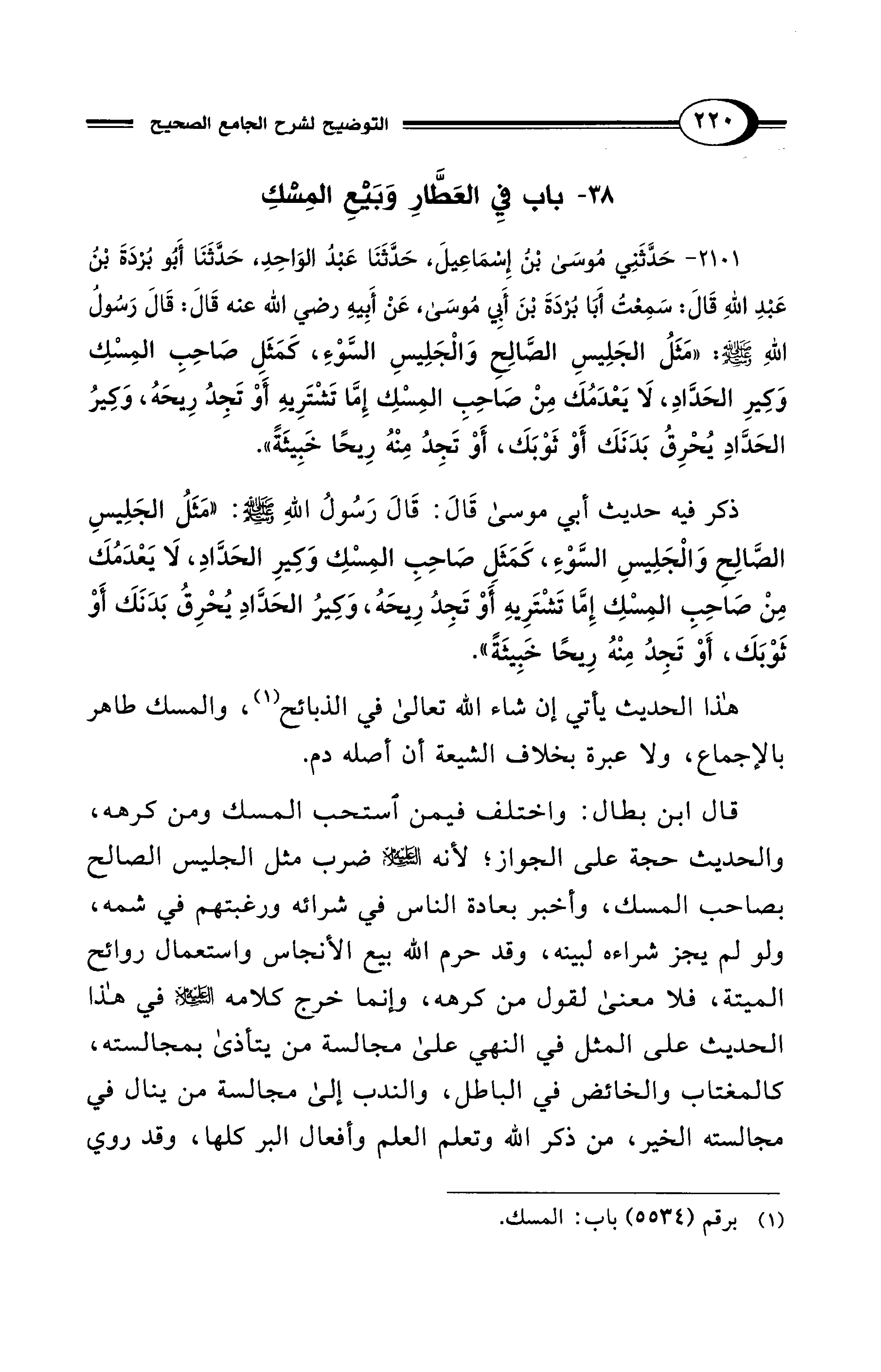 ذكر فيه حديث أبي موسى قَالَ: قَالَ رَسُولُ اللهِ - صلى الله عليه وسلم -: "مَثَلُ الجَلِيسِ الصَّالِحِ وَالجَلِيسِ السَّوْءِ، كَمَثَلِ صَاحِبِ المِسْكِ وَكِيرِ الحَدَّادِ، لَا يَعْدَمُكَ مِنْ صَاحِبِ المِسْكِ إِمَّا تَشْتَرِيهِ، أَوْ تَجِدُ رِيحَهُ، وَكِيرُ الحَدَّادِ يُحْرِقُ بَدَنَكَ أَوْ ثَوْبَكَ، أَوْ تَجِدُ مِنْهُ رِيحًا خَبِيثَةً".