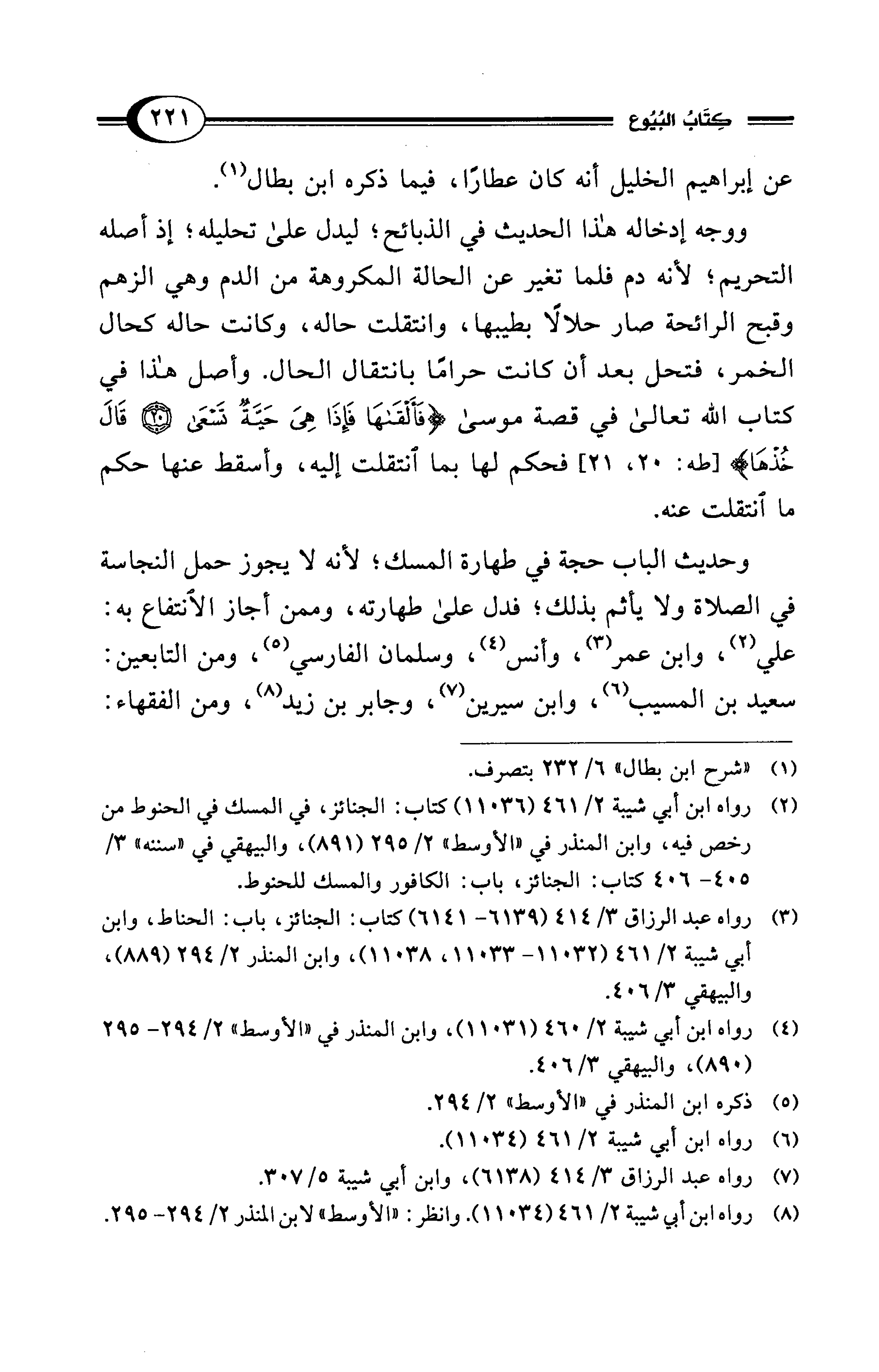 ووجه إدخاله هذا الحديث في الذبائح؛ ليدل على تحليله؛ إذ أصله التحريم؛ لأنه دم فلما تغير عن الحالة المكروهة من الدم وهي الزهم وقبح الرائحة صار حلالًا بطيبها، وانتقلت حاله، وكانت حاله كحال الخمر، فتحل بعد أن كانت حرامًا بانتقال الحال. وأصل هذا في كتاب الله تعالى في قصة موسى {فَأَلْقَاهَا فَإِذَا هِيَ حَيَّةٌ تَسْعَى (20) قَالَ خُذْهَا} [طه: 20، 21] فحكم لها بما انتقلت إليه، وأسقط عنها حكم ما انتقلت عنه.