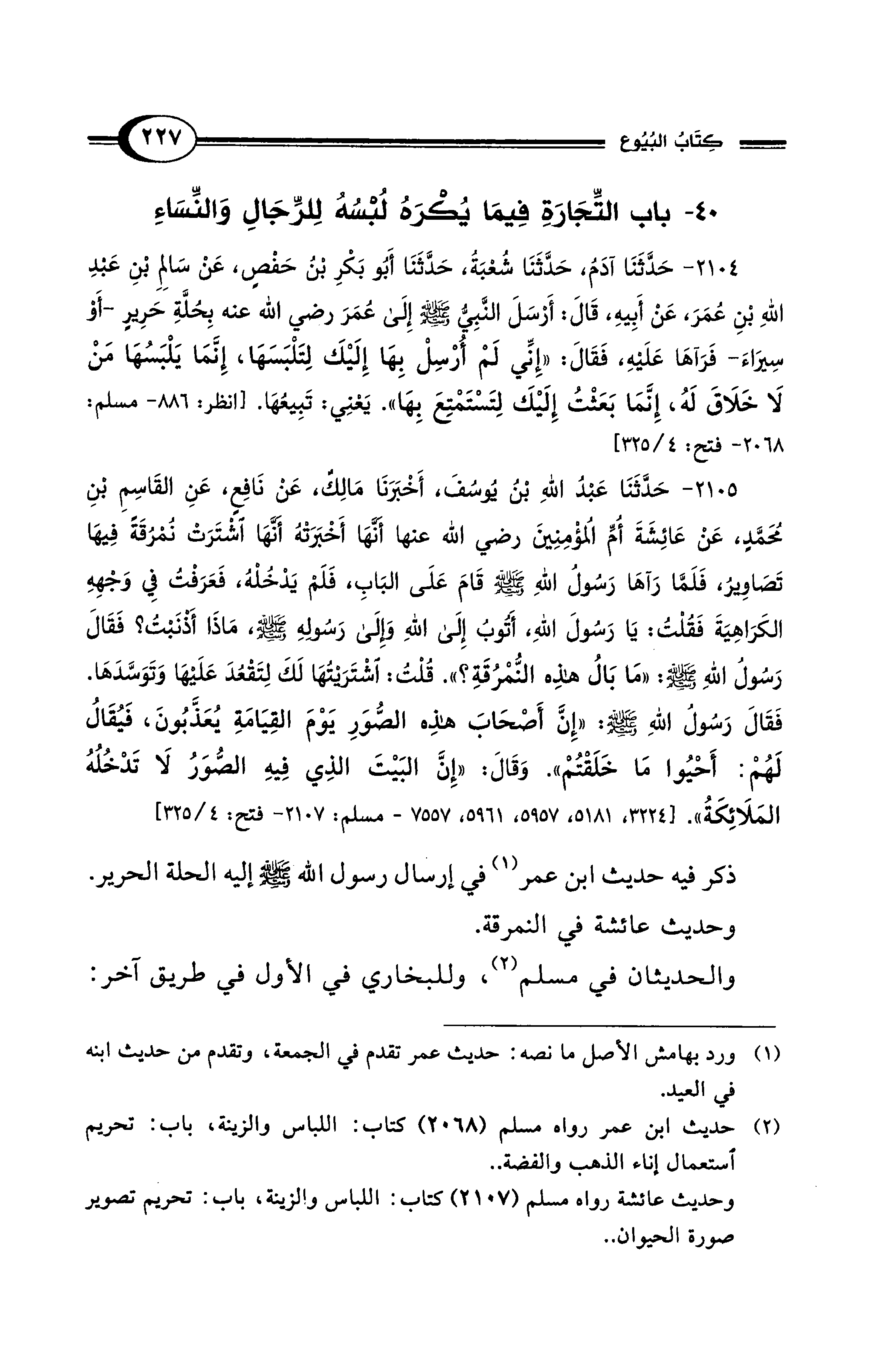 2104 - حَدَّثَنَا آدَمُ، حَدَّثَنَا شُعْبَةُ، حَدَّثَنَا أَبُو بَكْرِ بْنُ حَفْصٍ، عَنْ سَالِمِ بْنِ عَبْدِ اللهِ بْنِ عُمَرَ، عَنْ أَبِيهِ قَالَ: أَرْسَلَ النَّبِيُّ - صلى الله عليه وسلم - إِلَى عُمَرَ رضي الله عنه بِحُلَّةِ حَرِيرٍ -أَوْ سِيرَاءَ- فَرَآهَا عَلَيْهِ، فَقَالَ: "إِنِّي لَمْ أُرْسِلْ بِهَا إِلَيْكَ لِتَلْبَسَهَا، إِنَّمَا يَلْبَسُهَا مَنْ لَا خَلاَقَ لَهُ، إِنَّمَا بَعَثْتُ إِلَيْكَ لِتَسْتَمْتِعَ بِهَا". يَعْنِى: تَبِيعُهَا. [انظر: 886 - مسلم: 2068 - فتح: 4/ 325]