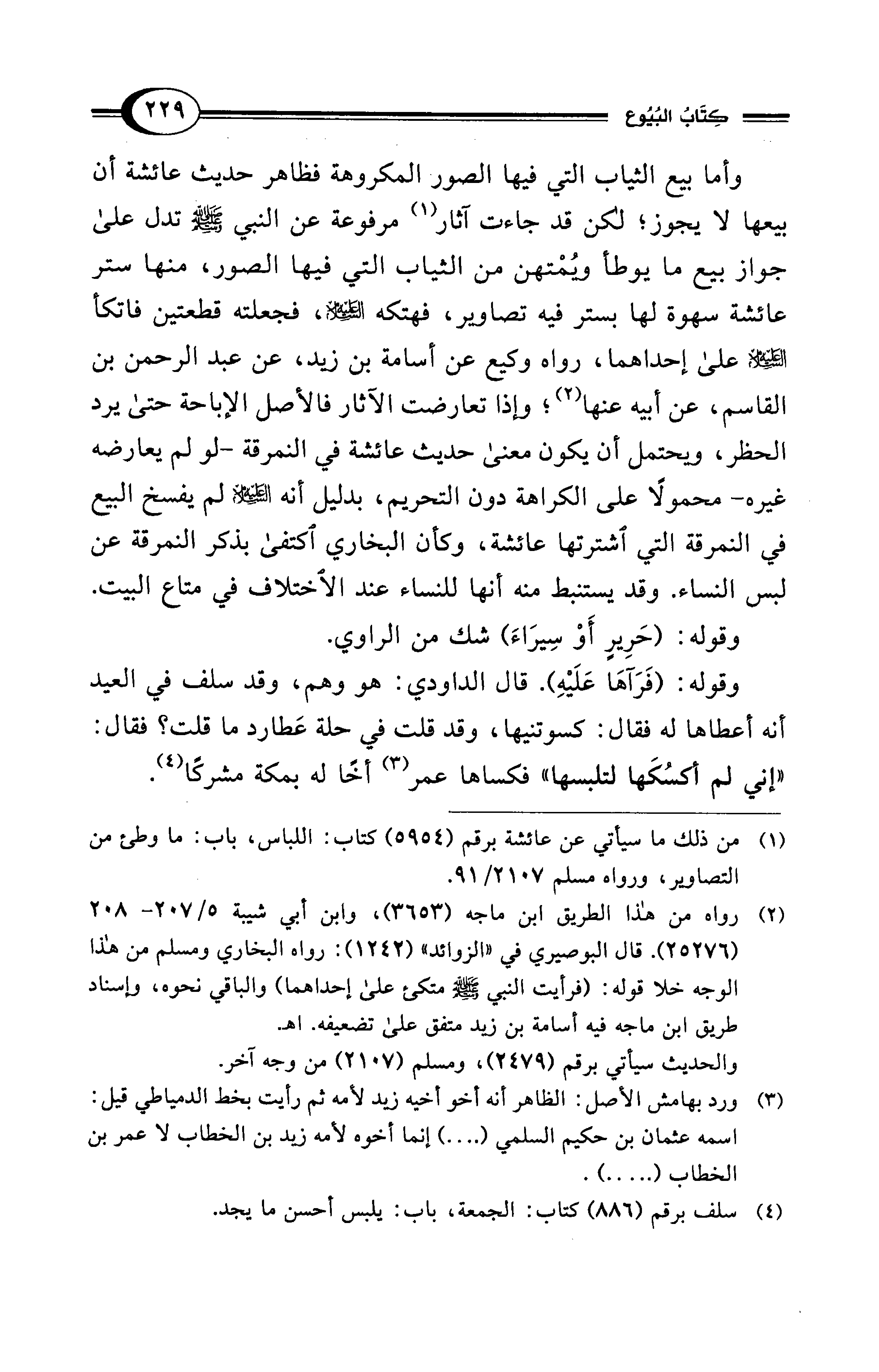 وأما بيع الثياب التي فيها الصور المكروهة فظاهر حديث عائشة أن بيعها لا يجوز؛ لكن قد جاءت آثار (¬1) مرفوعة عن النبي - صلى الله عليه وسلم - تدل على جواز بيع ما يوطأ ويُمْتهن من الثياب التي فيها الصور، منها ستر عائشة سهوة لها بستر فيه تصاوير، فهتكه - عليه السلام -، فجعلته قطعتين فاتكأ - عليه السلام - على إحداهما، رواه وكيع عن أسامة بن زيد، عن عبد الرحمن بن القاسم، عن أبيه عنها (¬2): وإذا تعارضت الآثار فالأصل الإباحة حتى يرد الحظر، ويحتمل أن يكون معنى حديث عائشة في النمرقة -لو لم يعارضه غيره- محمولًا على الكراهة دون التحريم، بدليل أنه - عليه السلام - لم يفسخ البيع في النمرقة التي اشترتها عائشة، وكأن البخاري اكتفي بذكر النمرقة عن لبس النساء. وقد يستنبط منه أنها للنساء عند الاختلاف في متاع البيت.