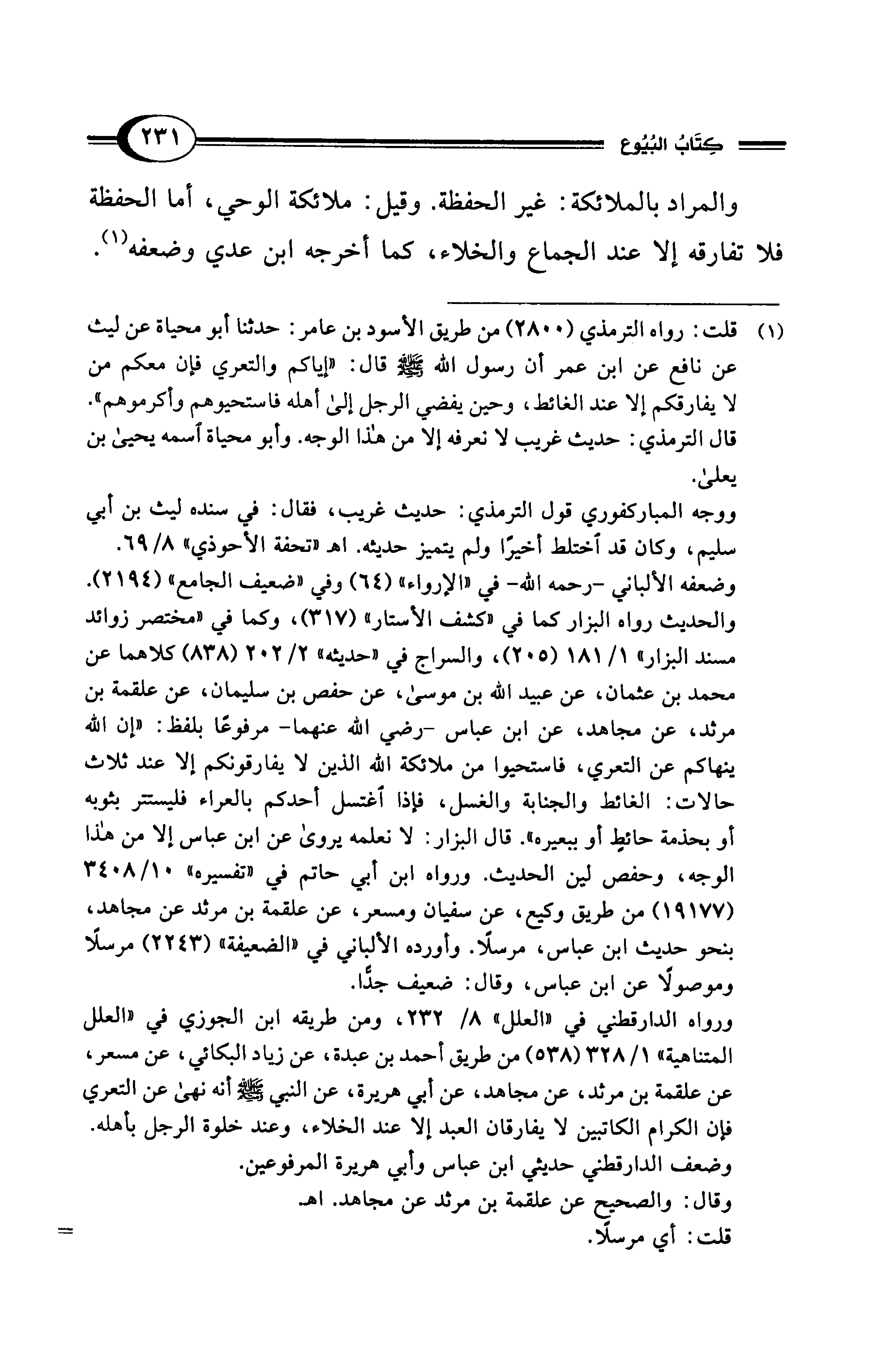 ورواه الدارقطني في "العلل" 8/ 232، ومن طريقه ابن الجوزي في "العلل المتناهية" 1/ 328 (538) من طريق أحمد بن عبدة، عن زياد البكائي، عن مسعر، عن علقمة بن مرثد، عن مجاهد، عن أبي هريرة، عن النبي - صلى الله عليه وسلم - أنه نهى عن التعري فإن الكرام الكاتبين لا يفارقان العبد إلا عند الخلاء، وعند خلوة الرجل بأهله.