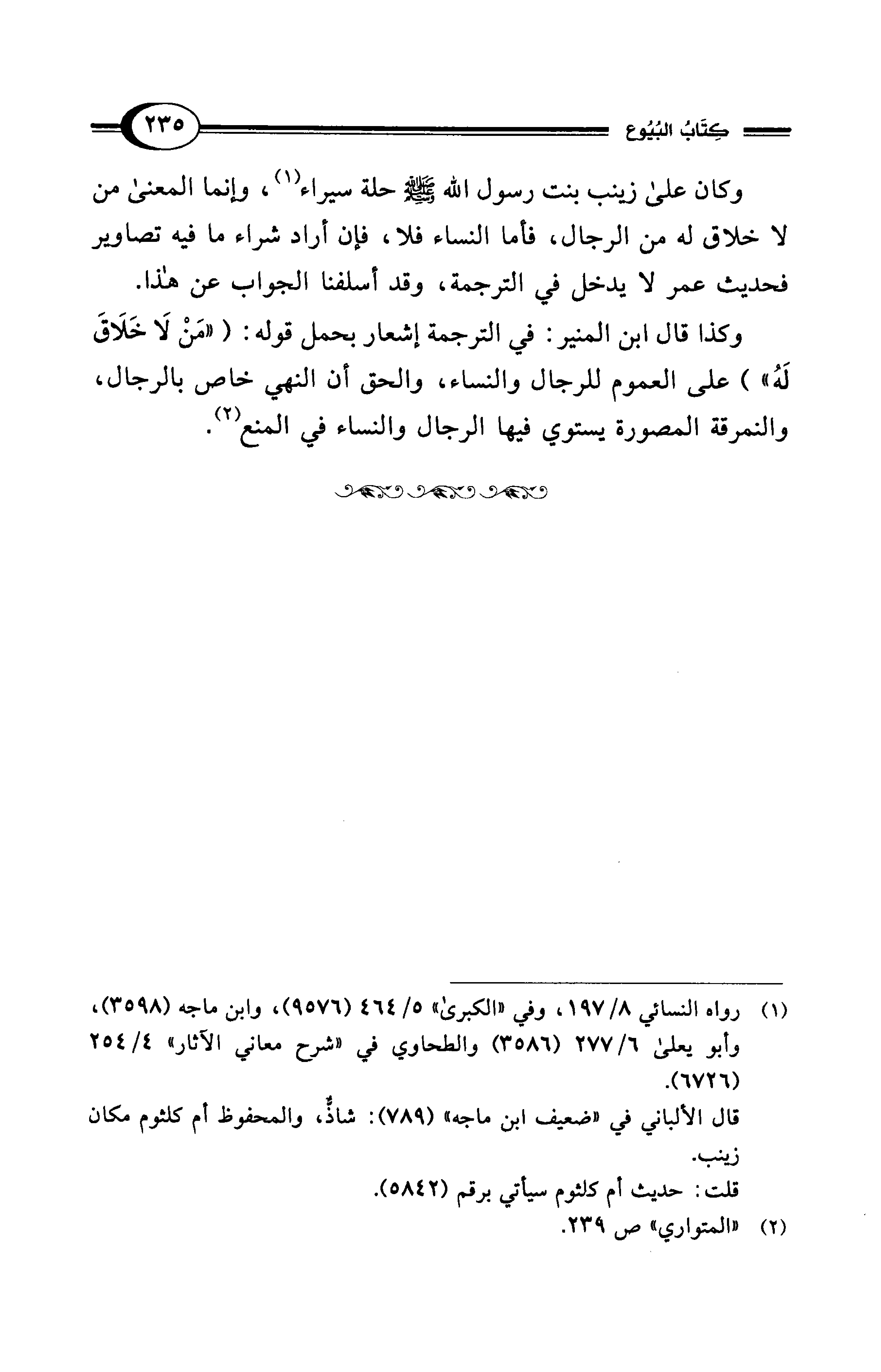وكان على زينب بنت رسول الله - صلى الله عليه وسلم - حلة سيراء (¬1)، وإنما المعنى من لا خلاق له من الرجال، فأما النساء فلا، فإن أراد شراء ما فيه تصاوير فحديث عمر لا يدخل في الترجمة، وقد أسلفنا الجواب عن هذا.