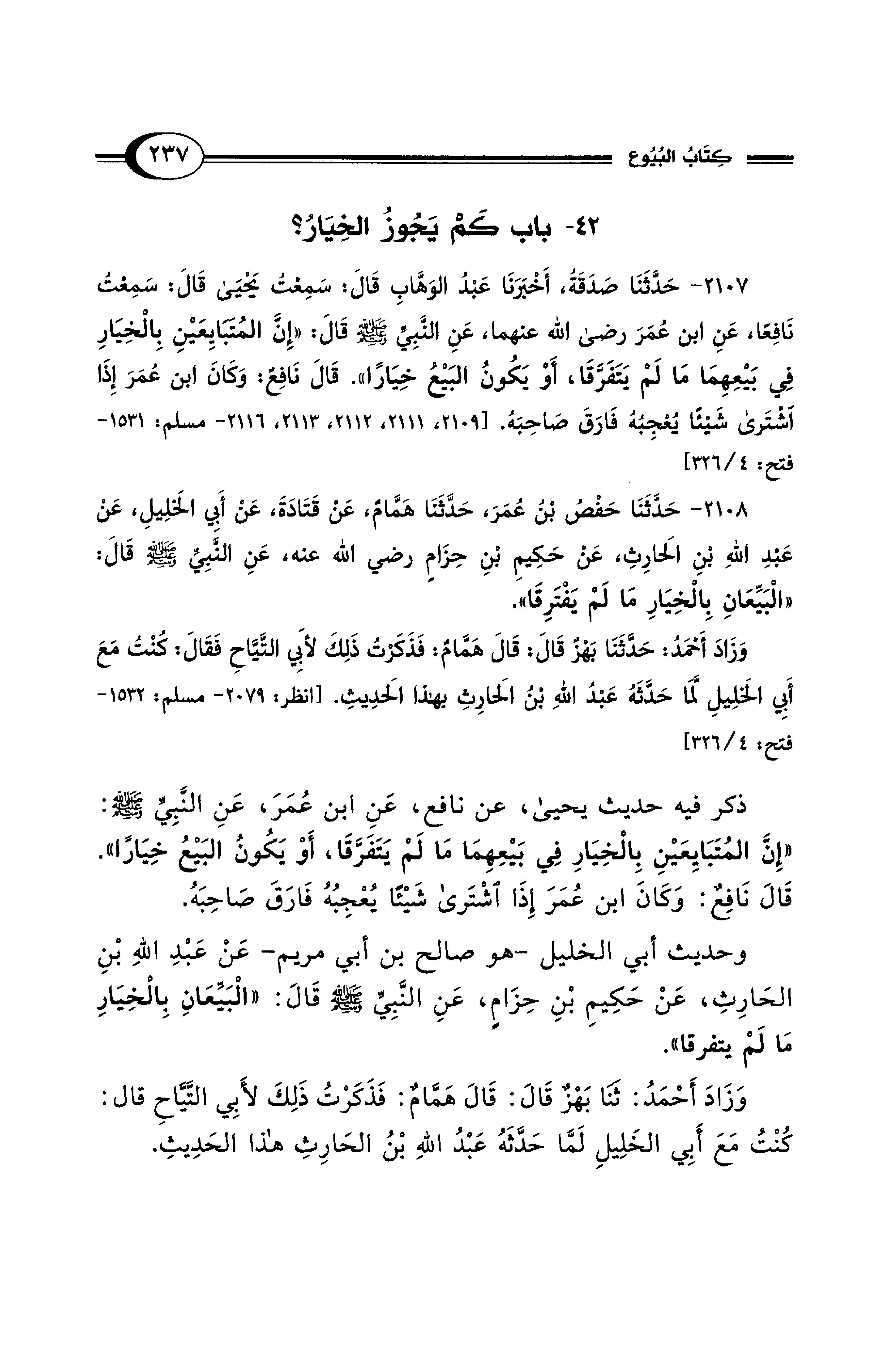 2108 - حَدَّثَنَا حَفْصُ بْنُ عُمَرَ، حَدَّثَنَا هَمَّامٌ، عَنْ قَتَادَةَ، عَنْ أَبِي الخَلِيلِ، عَنْ عَبْدِ اللهِ بْنِ الحَارِثِ، عَنْ حَكِيمِ بْنِ حِزَامٍ رضي الله عنه، عَنِ النَّبِيِّ - صلى الله عليه وسلم - قَالَ: "البَيِّعَانِ بِالخِيَارِ مَا لَمْ يَفْتَرِقَا" ..