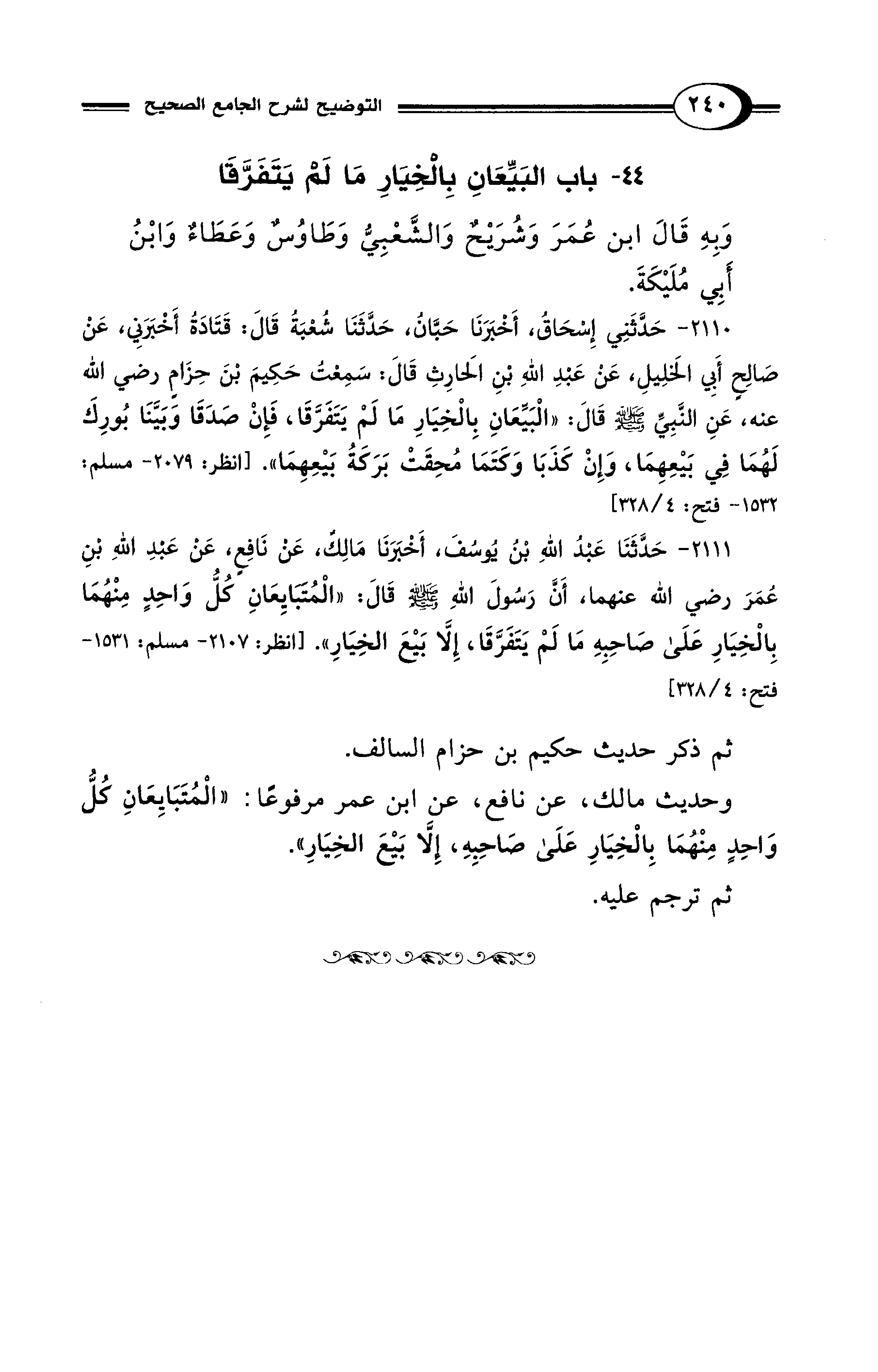 2111 - حَدَّثَنَا عَبْدُ اللهِ بْنُ يُوسُفَ، أَخْبَرَنَا مَالِكٌ، عَنْ نَافِعٍ، عَنْ عَبْدِ اللهِ بْنِ عُمَرَ رضي الله عنهما، أَنَّ رَسُولَ اللهِ - صلى الله عليه وسلم - قَالَ: "المُتَبَايِعَانِ كُلُّ وَاحِدٍ مِنْهُمَا بِالخِيَارِ عَلَى صَاحِبِهِ مَا لَمْ يَتَفَرَّقَا، إِلَّا بَيْعَ الخِيَارِ". [انظر: 2107 - مسلم: 1531 - فتح: 4/ 328]