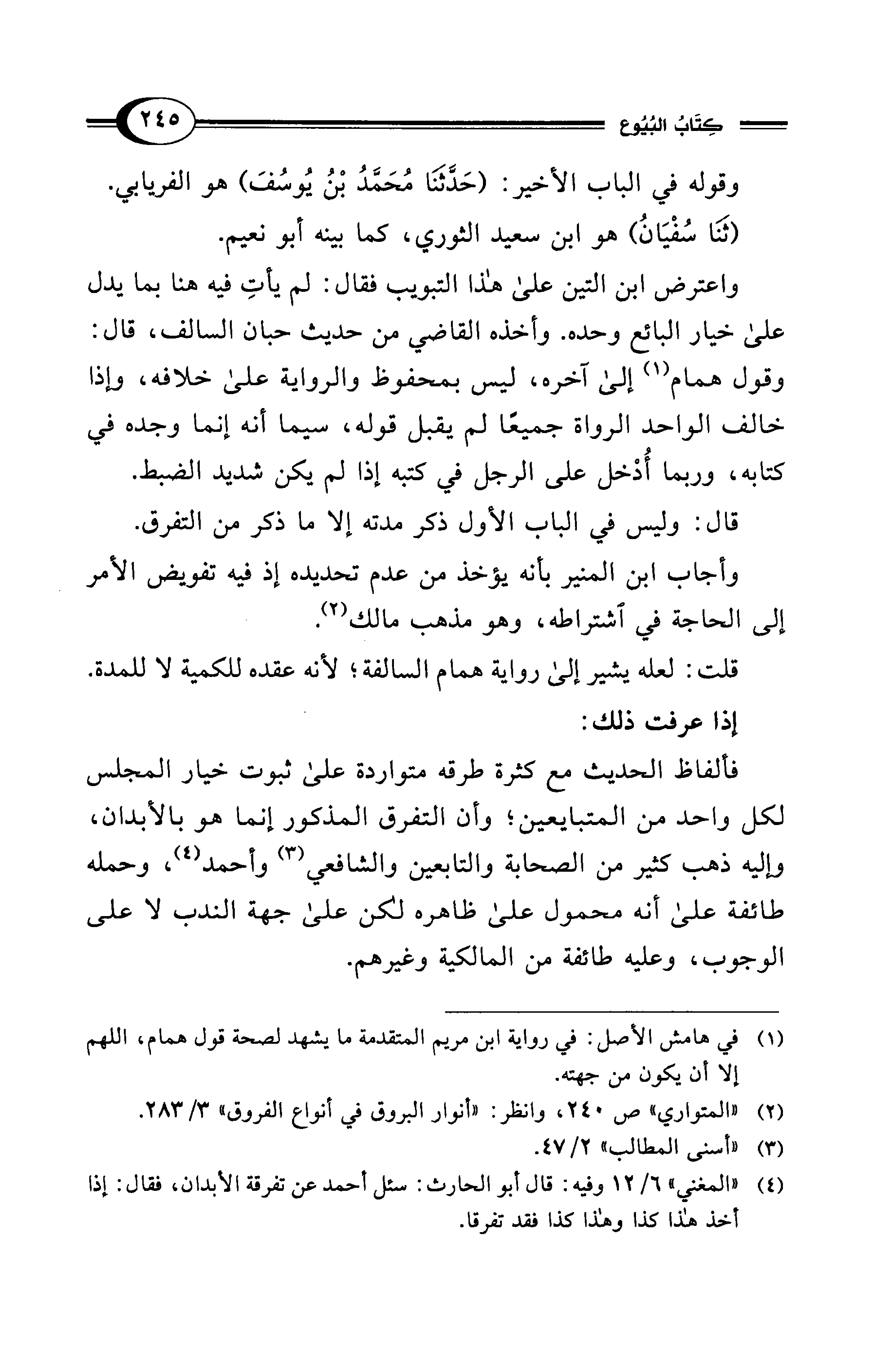 فألفاظ الحديث مع كثرة طرقه متواردة على ثبوت خيار المجلس لكل واحد من المتبايعين؛ وأن التفرق المذكور إنما هو بالأبدان، وإليه ذهب كثير من الصحابة والتابعين والشافعي (¬3) وأحمد (¬4)، وحمله