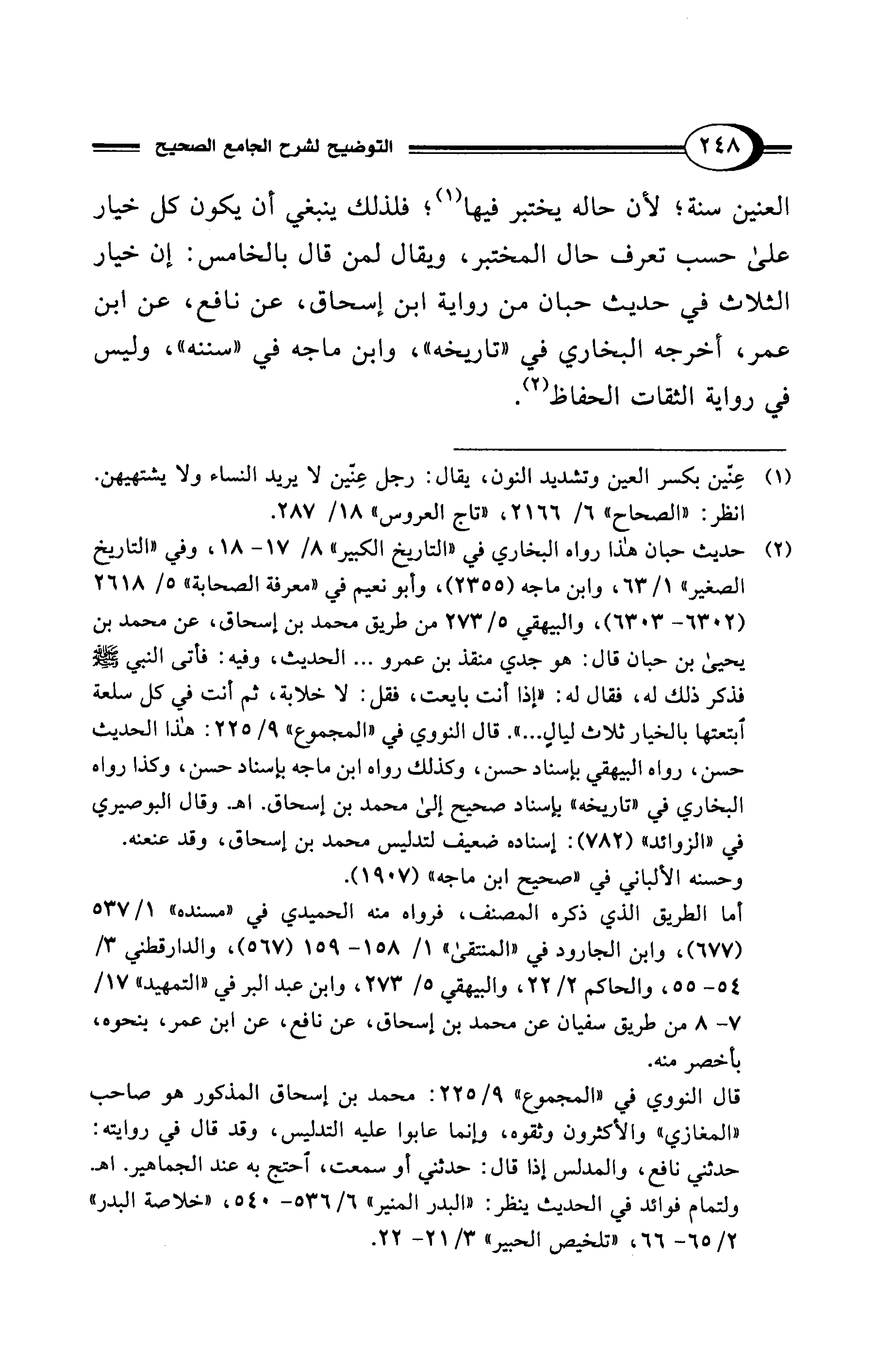 العنين سنة؛ لأن حاله يختبر فيها (¬1)؛ فلذلك ينبغي أن يكون كل خيار على حسب تعرف حال المختبر، ويقال لمن قال بالخامس: إن خيار الثلاث في حديث حبان من رواية ابن إسحاق، عن نافع، عن ابن عمر، أخرجه البخاري في "تاريخه"، وابن ماجه في "سننه"، وليس في رواية الثقات الحفاظ (¬2).